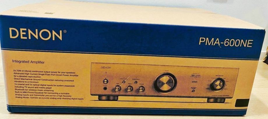 NOVO Denon PMA-600NE je funkcionalno integrirano pojačalo snage 2 x 70 W. Opremljeno je digitalno-analognim pretvaračem, gramofonskim pretpojačalom i Bluetooth prijemnikom. Još u kutiji, orig. pack.