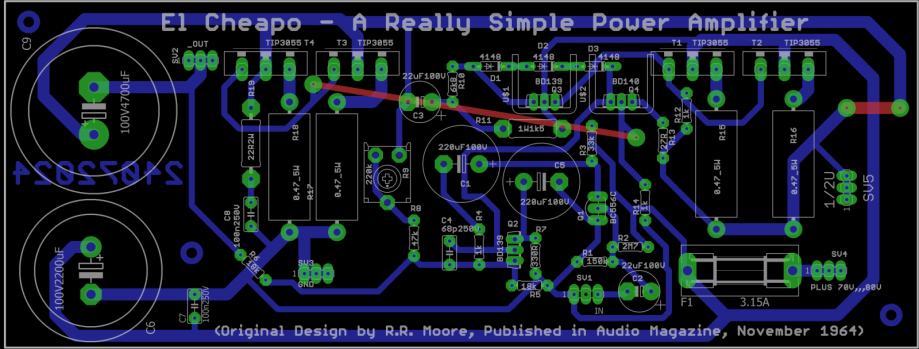 Izvorno dizajnirao R.R. Moore i objavljen u Audio Magazine (izdanje iz studenog 1964.), dizajn je predstavljen više zbog povijesnog interesa nego kao preporučeni dizajn. Iako nije loše pojačalo prema tadašnjim standardima, smatrat će se da nedostaje u usporedbi s bilo kojom modernijom ponudom. To će vrijediti čak i ako koristite najnovije tranzistore, jer pojačalo ima vrlo ograničeno pojačanje otvorene petlje. Neki ljudi to vide kao prednost, a ne kao ograničenje, ali to znači da će niska razina nelinearnog izobličenja biti veća nego što ste navikli. Opis Pojačalo se zvalo "El Cheapo 2-30" i imalo je maksimalnu snagu od 30 W po kanalu na 16 Ohma (što je prije bila vrlo uobičajena impedancija zvučnika). Koristio je jedno regulirano napajanje i zvučnik spojen kondenzatorom. Imajući skenirani izvornik, sada mogu reproducirati točne detalje kruga. Bilo je to vrlo jednostavno pojačalo i koristilo je kvazi-komplementarnu simetriju za izlazni stupanj. Za one mlađe od mene koji nemaju pojma o čemu govorim, kvazi-komplementarna simetrija bila je shema koja se koristila u danima kada su PNP tranzistori bili skupi, a silikonski uređaji prilično beskorisni. Ako ste htjeli bilo kakvu vrijednost napona i struje, morali ste koristiti NPN uređaje. Kvazi-komplementarni izlazni stupanj koristio je (diskretni) Darlington za pozitivnu stranu i komplementarni par za negativnu (tj. PNP pokretač spojen na NPN tranzistor snage). U međuvremenu, u to vrijeme, ako ste željeli visoko pojačanje i razuman kapacitet struje, germanijski tranzistori su i dalje bili glavni. Pod uvjetom da su se koristili u aplikacijama gdje curenje nije bilo veliki problem, uređaji s germanijem su radili vrlo dobro - to ipak nije uključivalo izlazne stupnjeve pojačala snage. Tada je većina zvučnika bila od 16 Ohma, a samo je nekoliko njih spuštalo do 8 Ohma. Sve niže od toga bilo je gotovo nečuveno 1964. godine. Slika 1 prikazuje krug - to je bilo jeftino pojačalo u usporedbi s većinom tadašnjih ponuda. Također je uspjelo zvučati respektabilno - opet za usporedbu - i napravio sam par kao i mnogi moji tadašnji prijatelji. Za hi-fi, PA sustave, pa čak i gitarska pojačala (ali nisu bila baš dobra u tome), El-Cheapo je u to vrijeme bio posvuda!