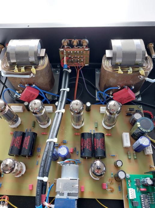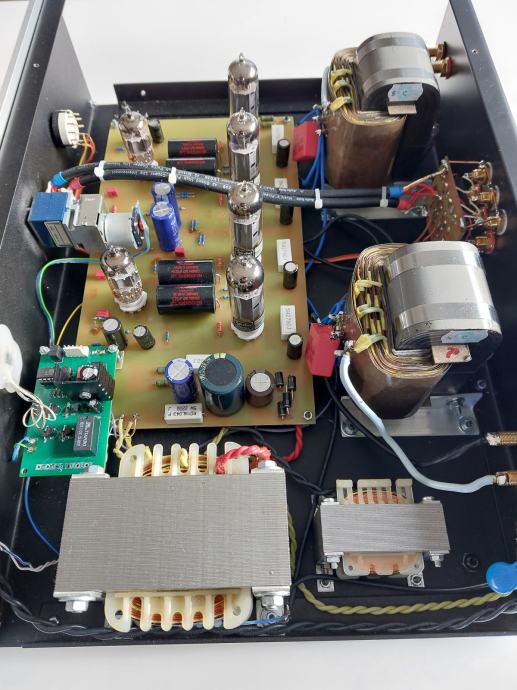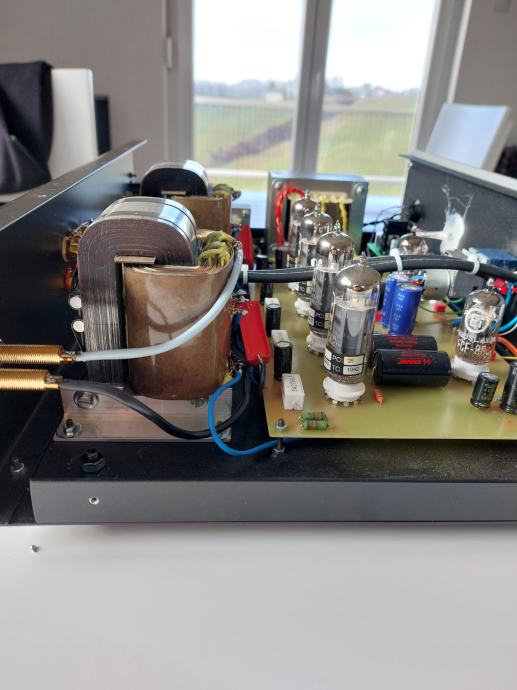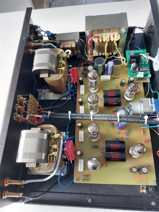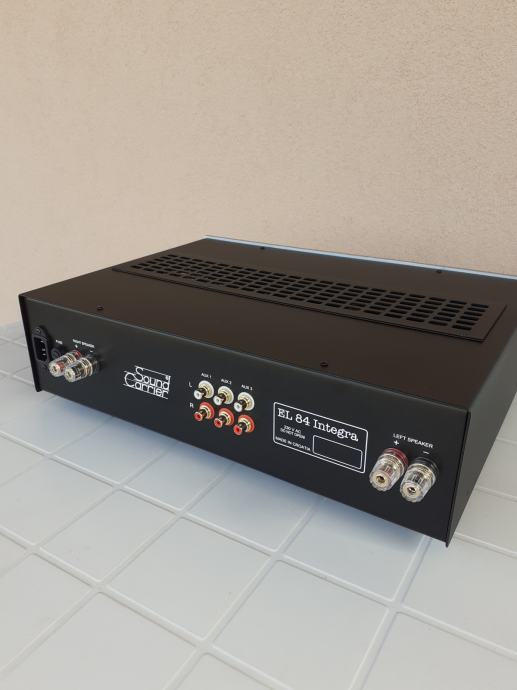 Integrirano pojačalo EL 84 Integra, tri linijska ulaza, snage 2 X 17 W, vrlo dinamičnog i bogatog zvuka, daljinski volume control, dimenzije 440 x 360 x 125 mm, sa elektronkama 4 x EL 84 - STR REDBASE TAD PREMIUM Matched, i 2 x ECF 80 Ei, Mundorf kondenzatori, izlazni transformatori na C-jezgrama, ožičenje Audio Note, ALPS motorizirani potenciometar, karbonski otpori, relejni selektor ulaza, itd, prodajem za 1330 EUR. Uređaj je detaljno opisan na blogu Audiokuhinja Mladena Krkleca. Telefon 091/567-2703