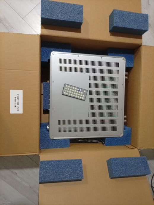 Jedan kanal neispravan, ima smetnje kad se pojača. Predpojačalo je ispravno te se tako može koristiti bez problema. Nema ogrebotina na kućištu, daljinac, ambalaža...