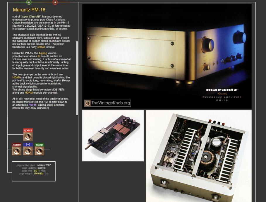 Basis of all Marantz amplifiers since then, the PM-16 is centered around multiple current feedback loops and 40MHz fT LAPT emitter power transistors. Three CCNE circuits are present for cleaner power supply.