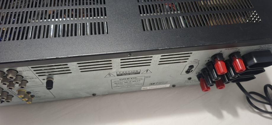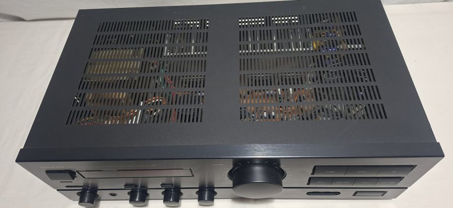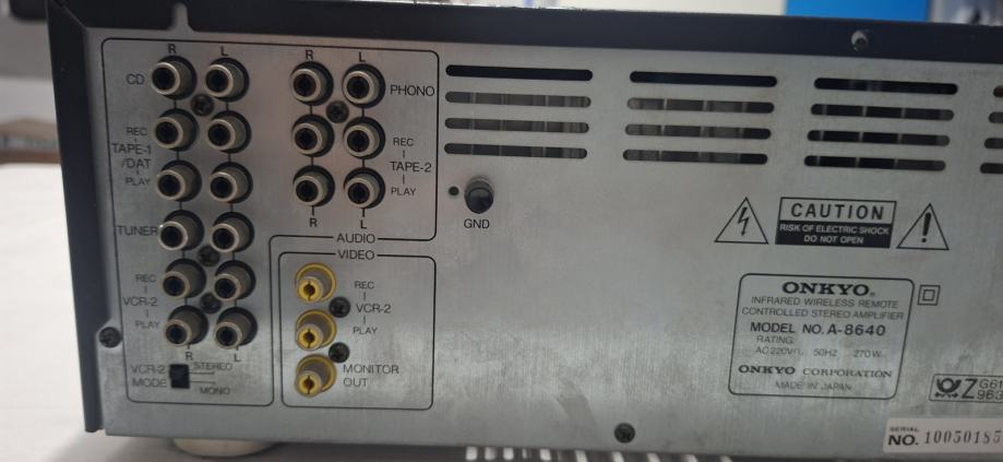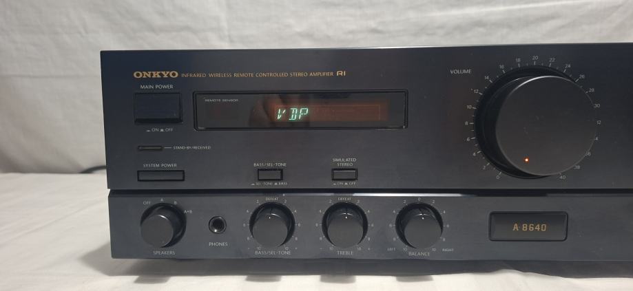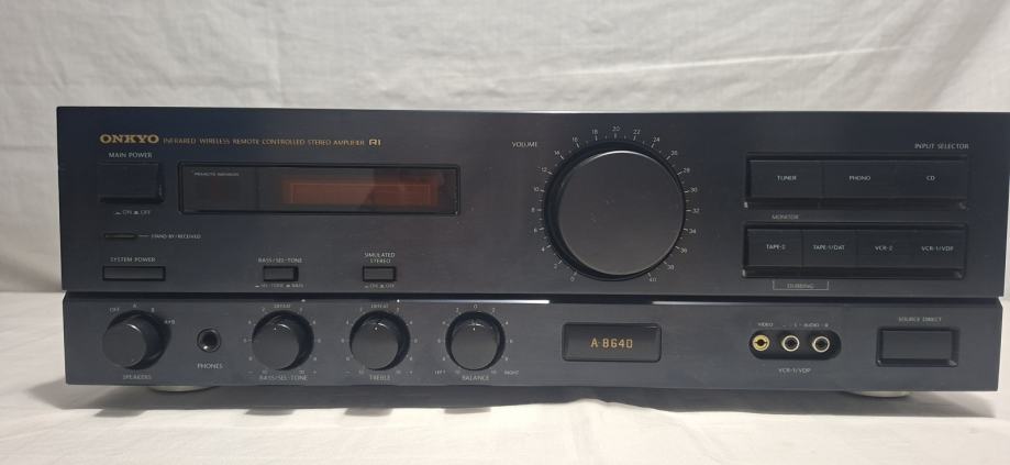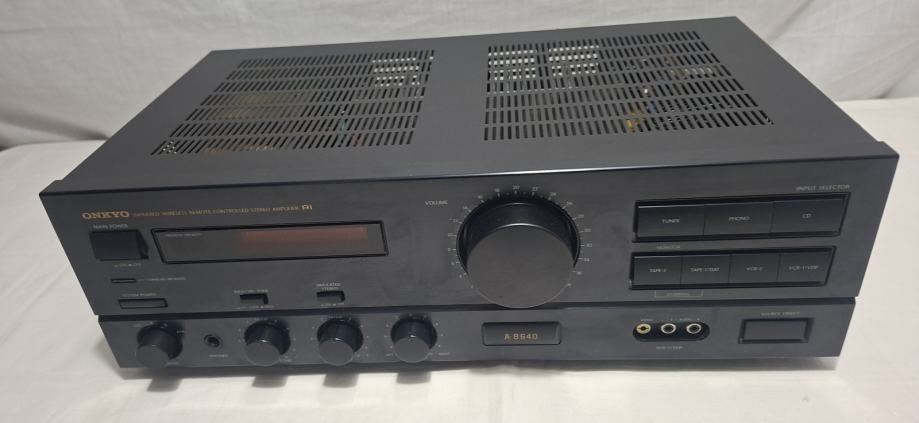 Onkyo A-8640 spada u tzv. „klasu jačih srednjih integriraca“ iz kasnih 80-ih. U to vrijeme Onkyo je bio među najcjenjenijim japanskim proizvođačima pojačala. Kod ovog modela Onkyo je koristio tada vrhunske dijelove: veliki toroidni / EI transformator, SanKen tranzistori, diskretni elementi (bez jeftinih IC rješenja). Kod mnogih primjeraka ugrađeni su ALPS potenciometri. Dizajnirano za pasivno hlađenje (nema ventilatora), koje se i nakon dugog slušanja, ne pregrijava nenormalno. Onkyo A-8640 ima tipičan “klasični Onkyo” zvuk iz kasnih 80-ih i ranih 90-ih čist, kontroliran i neutralan, sa malo topline. Naravno, precizna percepcija ovisi o zvučnicima, prostoru i izvoru. Zvuk je neutralan i prirodan, ne naglašava ni bas ni visoke nego služi se ravnim, linearnim karakterom, to daje glazbu koja zvuči realno i čisto, bez pretjerane topline ili oštrine. Bas je dubok i kontroliran i nije napuhan, nego zategnut, brz i dobro definiran. Ovo je djelomično rezultat solidne snage i pristojnog damping faktora – pojačalo ima dovoljno kontrole nad tipičnim hi-fi zvučnicima. Uglađeni visoki tonovi su čisti, bez zrnaste hrapavosti, dovoljno detaljni, ali ne agresivni. Zbog toga je ugodan za dugotrajno slušanje. Srednji tonovi su vrlo lijepo prezentirani, čisti i otvoreni, topli, puni i glatki, vokali zvuče prirodno i stabilno, što ovaj model čini dobrim izborom za jazz, vokalnu glazbu, akustiku i klasične žanrove. A-8640 reproducira dobru široku stereo scenu i solidnu dubinu uz jasno razdvajanje instrumenata i daje vrlo prostoran i stabilan stereo prikaz. Vrlo dobra mikro i makro dinamika za analogno pojačalo srednje klase, dovoljno je “brza” i živa. Gromoglavi tranzijenti (npr. udarci bubnja) zvuče energično, ali ne prenaglašeno. Ukratko : Onkyo A-8640 zvuči neutralno, čisto i prirodno, s uglađenim visokima, toplim i izražajnim srednjim tonovima te čvrstim, kontroliranim basom, nudeći vrlo ugodnu i nenametljivu prezentaciju. Onkyo A-8640 je iznadprosječno kvalitetno pojačalo za svoju klasu i period, i danas se smatra jednim od boljih Onkyo modela. Odlično vintage pojačalo koje i danas lako može posramiti moderna pojačala do 300–400 €. Uređaj je stručno pregledan, potpuno ispravan i funkcionalan, a vizualno se vide sitni tragovi korištenja na zadnje 2 slike.