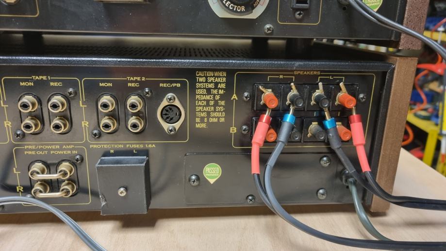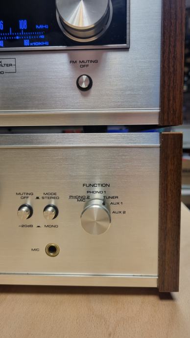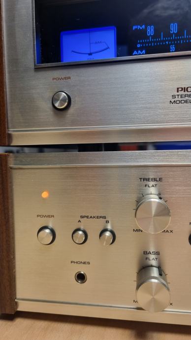 Tuner odlično lovi stanice i bez antene, pojačalo s dva Phono inputa, izlazi za dva seta zvučnika. 1974 godina.
