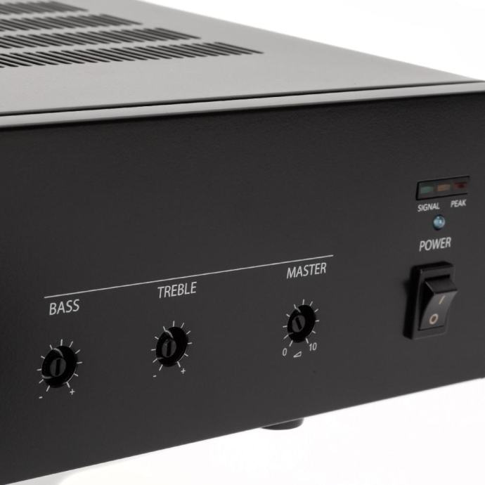 Izlaz pojačala dostupan je ili za zvučnike niske impedancije (min. 4 Ohma) ili za liniju konstantnog napona 100 – 70 V (za zvučnike koji imaju transformatore od 100 – 70 V). Osim priključka na električnu mrežu, može se napajati i baterijama (napon: 24 V dc), kako bi se osigurao njegov ispravan rad čak i kada mrežno napajanje nije dostupno.