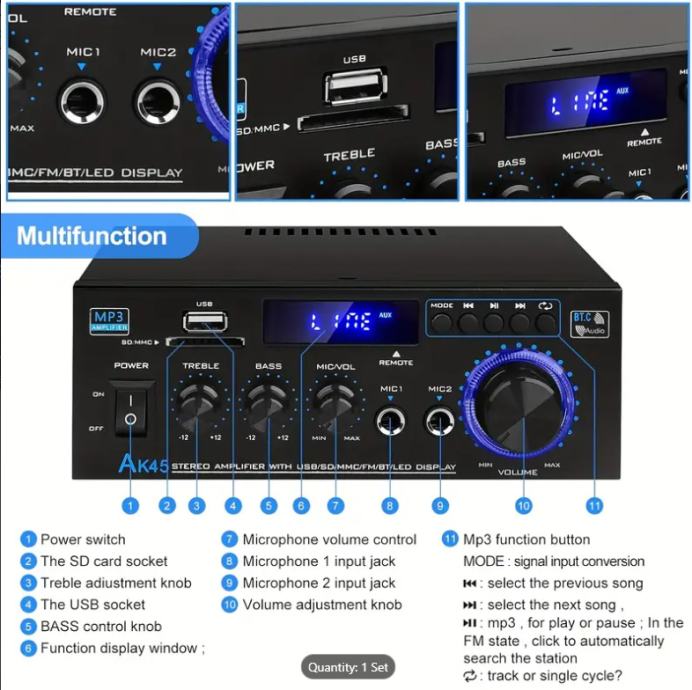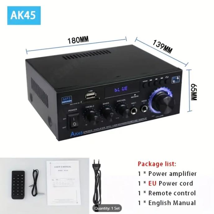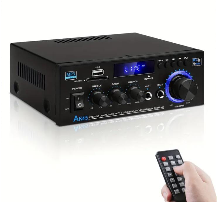 Novo pojačalo AK 45, 2x40 watta, BT, Radio, SD kartica, USB, daljinski upravljač, impedanca zvučnika od 4 do 16 ohm, može u sutomobil ili za kucnu upotrbu, 0915567695