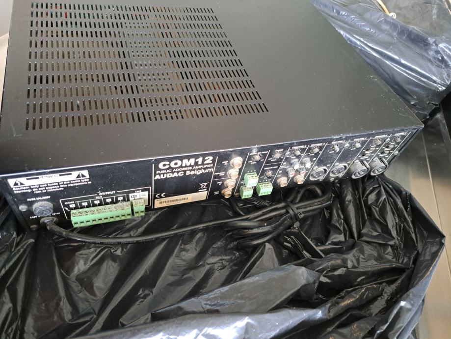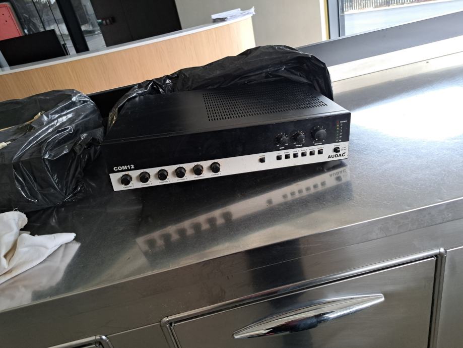 Audac COM12, profesionalno 100- voltno mikser pojačalo snage 120 W prvenstveno namijenjeno za ozvučenje javnih prostora poput kafića, hotela, restorana ili trgovina.ima 5 zona, podržava 100V i 4 Ohma te ima prioritetne ulaze za mikrofon.
