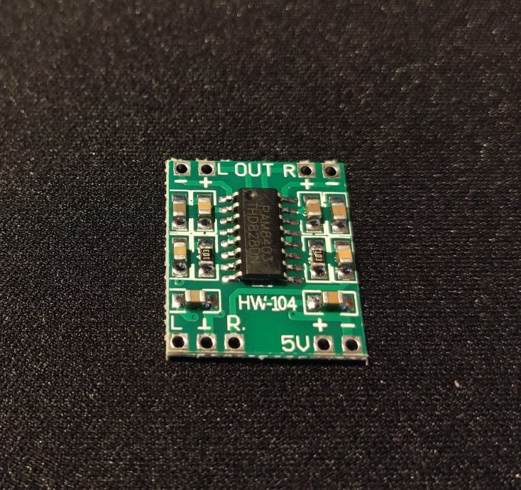 Novo pojačalo PAM8403. Napajanje 2,5V - 5,5V. Impedancija zvučnika 4ohm - 8ohm. Izlazna snaga 2x3W.
