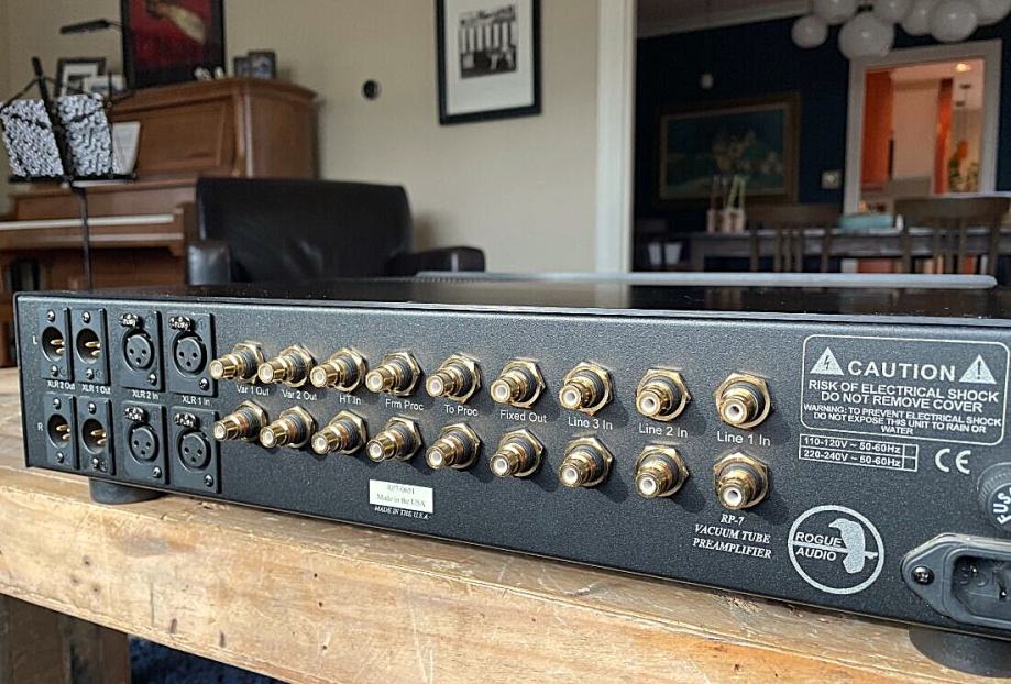 U ponudi je 4 godine star Rogue Audio RP-7 hibridni linijski preamp , kombinacija cijevi i mosfeta . Sjajno surađuje s Pass izlaznim ampovima . Dolazi s kompletnom ambalažom i daljinskim upravljačem .