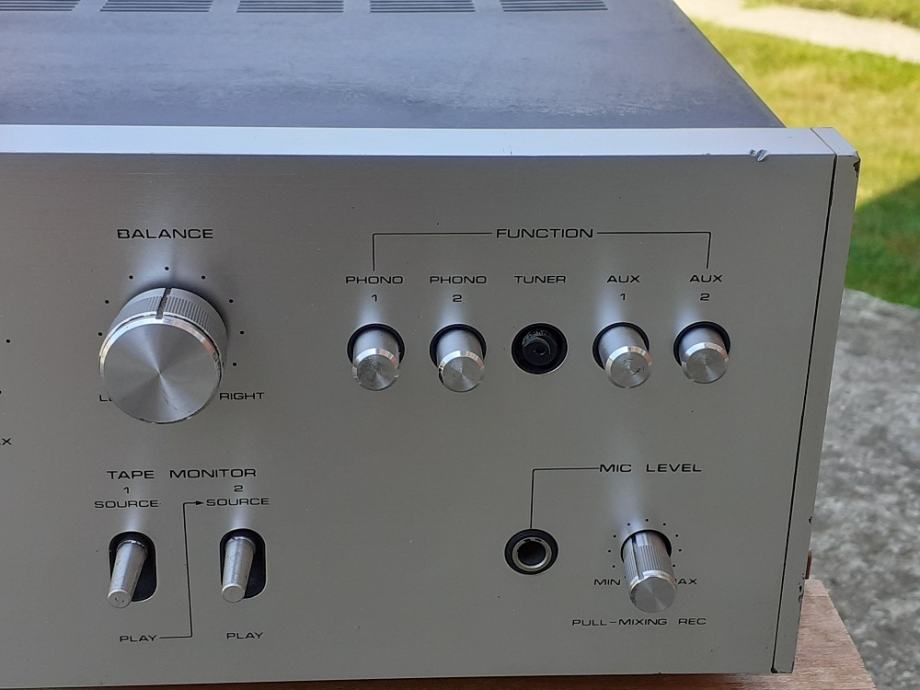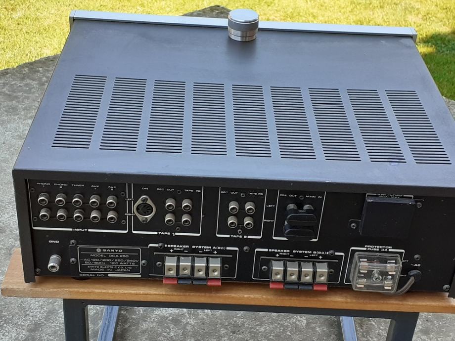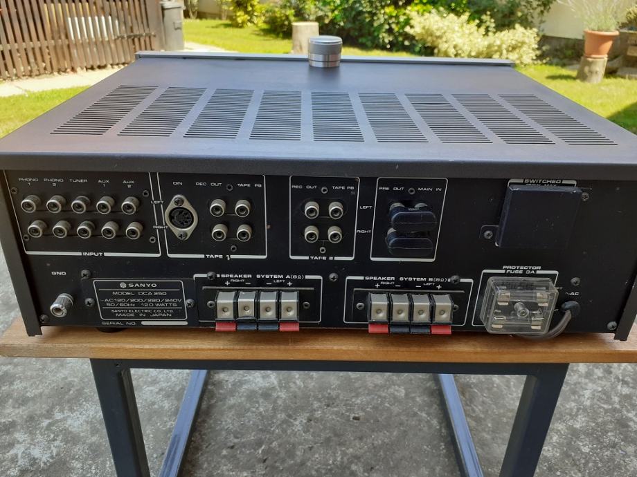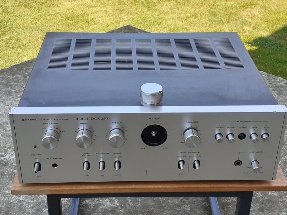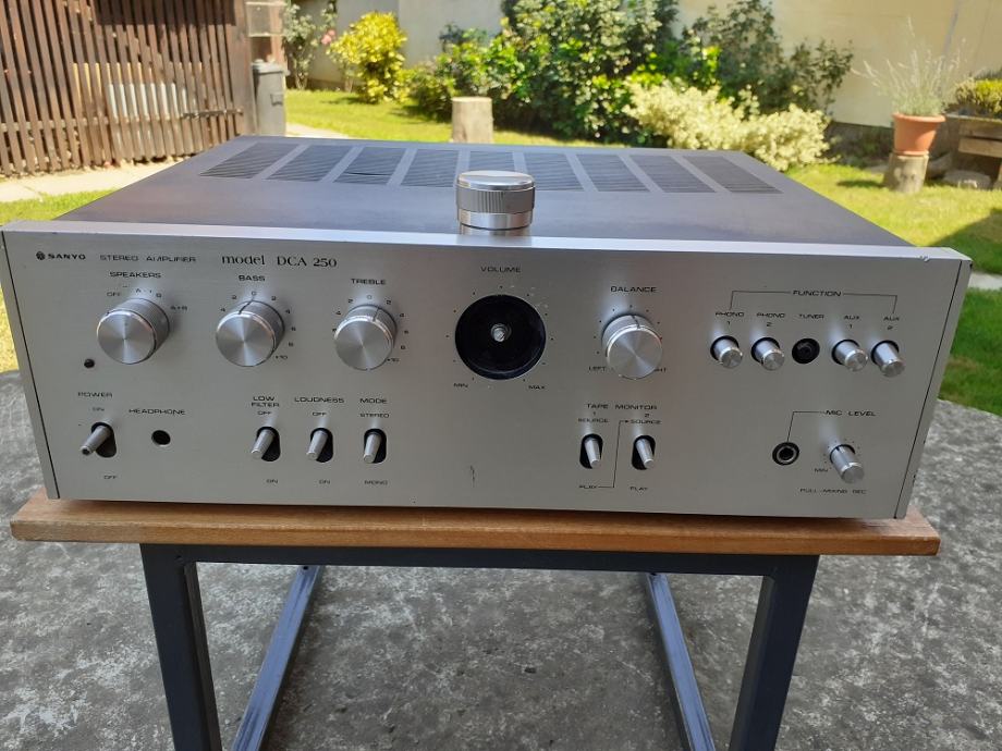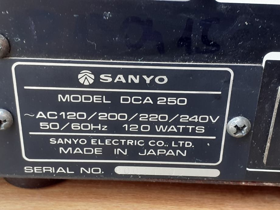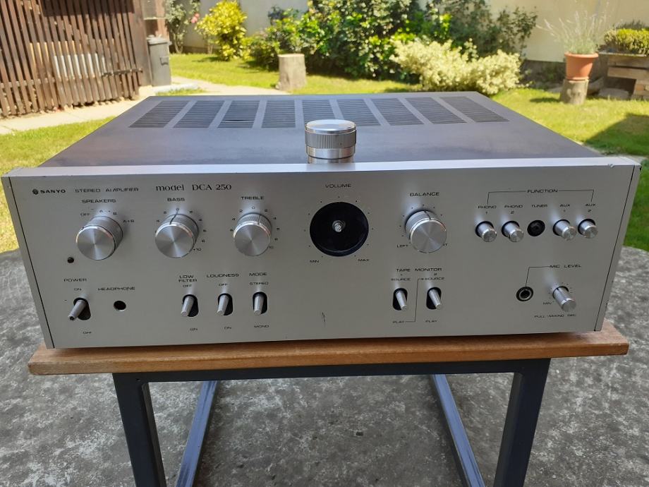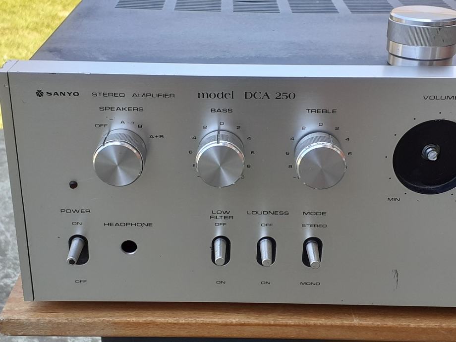 Prodajem pojačalo Sanyo DCA 250 iz 1973 -76 godine, Dimencije 420 x 130 x 330 mm i težine 10,2 kg. Neispravno - jedan kanal radi nornalno, a drugi izobličava. Pukla osovina na potenciometru volumena. Fali kapica na selektoru, a jedna ispada. Za majstore i entuzijaste, Stanje vidljivo na slikama.