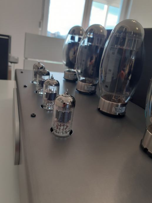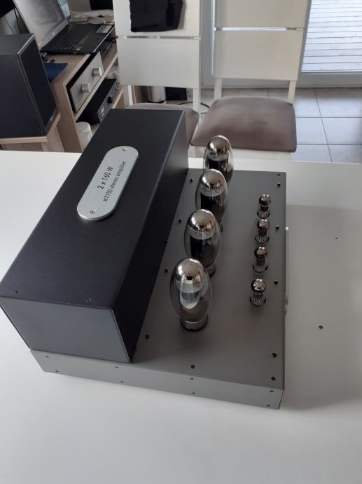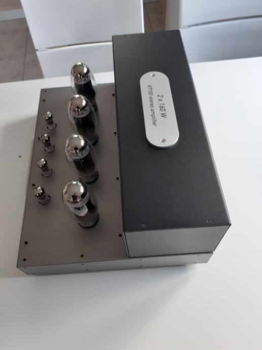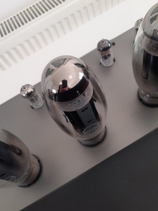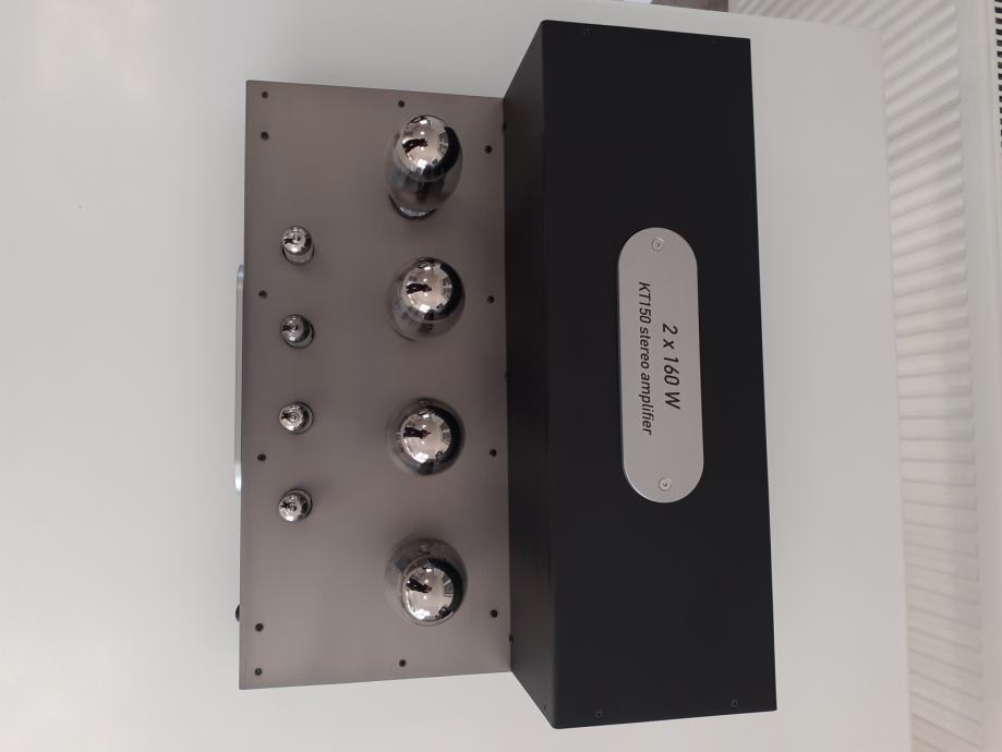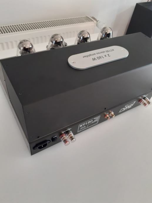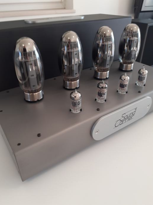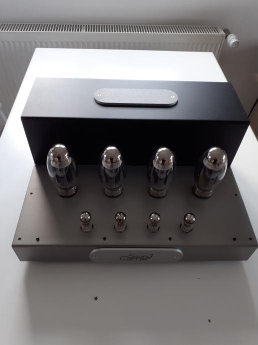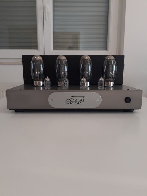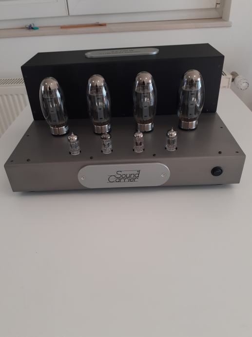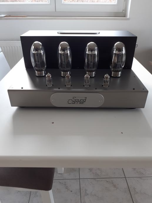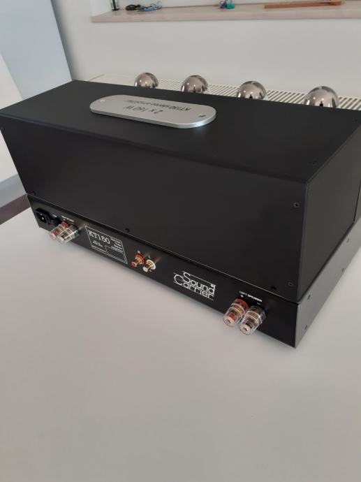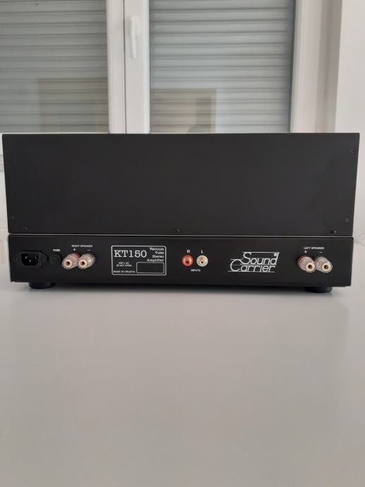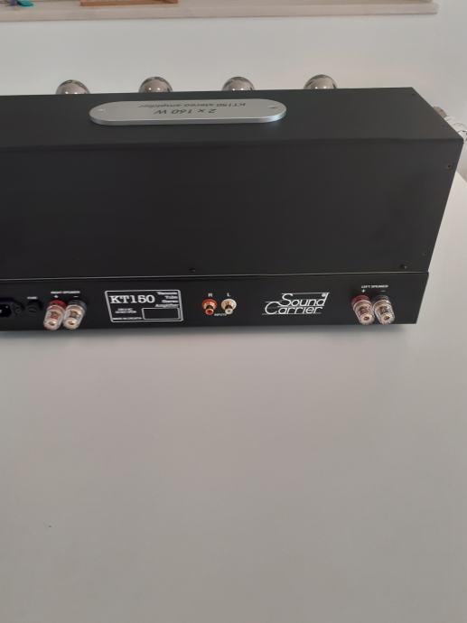 Stereoizlazno pojačalo Sound Carrier KT 150, snage 2 x 160 W na 4 ili 8 ohma, ulazna osjetljivost 1,4 V za punu snagu, dimenzije uređaja 473 x 400 x 225 mm, težina cca 32 kg, upotrebljene elektronke 4 x KT 150, 2 x ECC 82 i 2 x ECC 83, sve elektronke su Tungsol. Može se pročitati test na Too loud blogu. Pojačalo je potpuno novo i neusvirano. Cijena je 2400 EUR. Telefon 091/567-2703