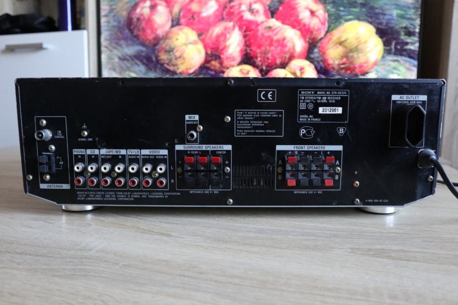 Prodajem **Sony STR-DE325** AV receiver, pouzdan uređaj koji nudi **izuzetan zvuk** i **visoku funkcionalnost** za kućno kino ili glazbeni sustav. Iako ima **neka oštećenja s vanjske strane (ogrebotine i manje posljedice korištenja)**, to nema nikakvog utjecaja na njegovu izvedbu – radi ispravno i pruža čist, moćan zvuk!
