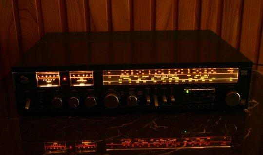 A large, discreetly yellow-lit scale display for FM & AM programs and two VU-level meters with yellow illumination showing signal strength and tuning are immediately noticeable.