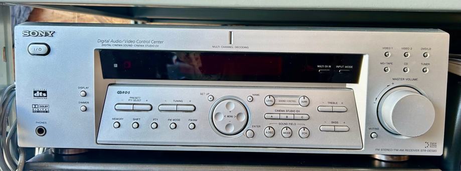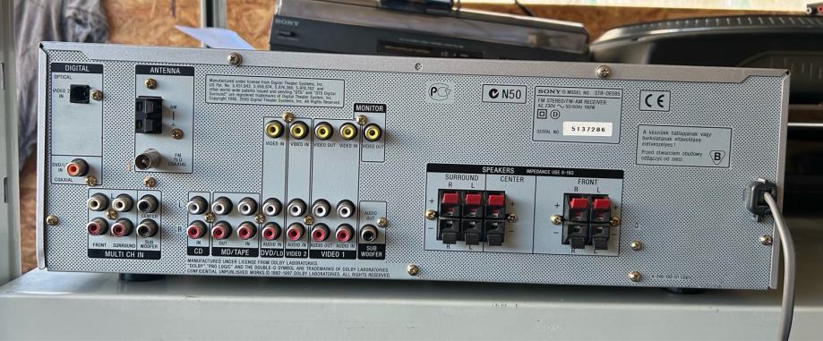 Prodajem Sony STR-DE 585 receiver, kvalitetan AV receiver s mnoštvom mogućnosti povezivanja. Receiver ima digitalni display, FM/AM tuner te brojne audio i video ulaze i izlaze na stražnjoj strani. Prednja ploča opremljena je s kontrolama za različite funkcije, velikim regulatorom glasnoće te priključcima za slušalice. Na stražnjoj strani nalaze se RCA priključci za višekanalni zvuk, video ulazi i izlazi, te priključci za zvučnike s mogućnošću povezivanja nekoliko setova. Uređaj podržava Dolby surround zvuk i ima sve potrebno za kućno kino postavljanje ili hi-fi sustav. 100W po kanalu na 8 ohma.