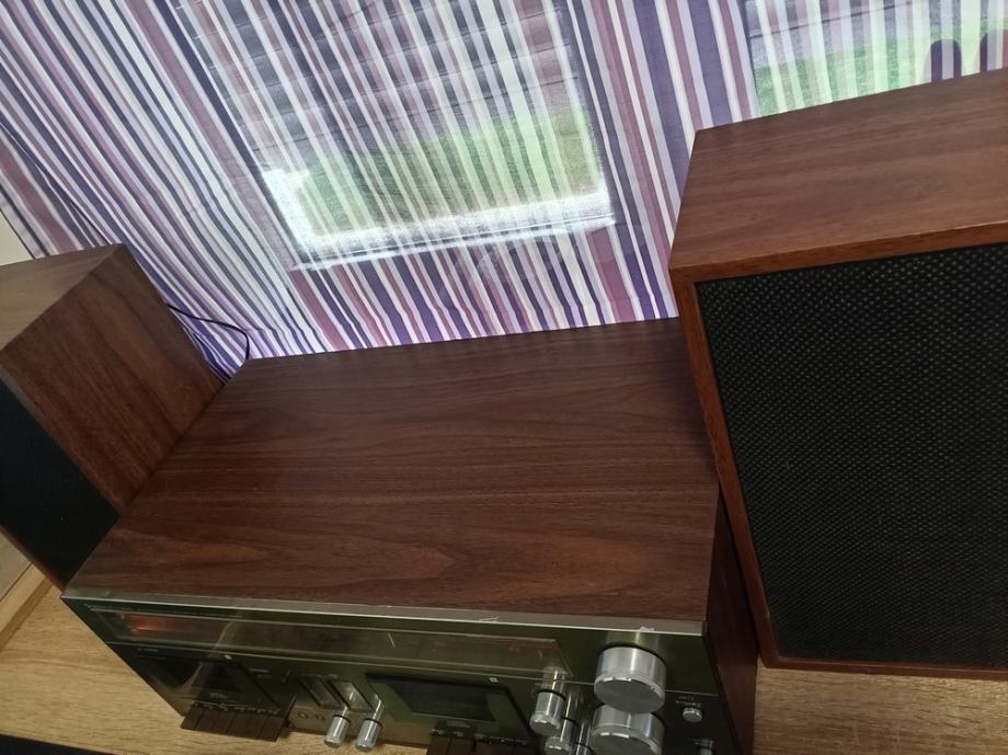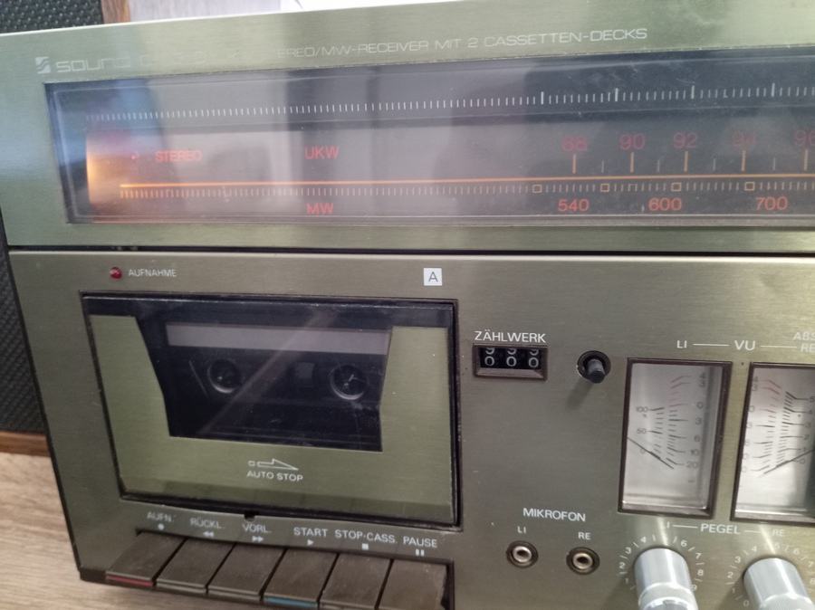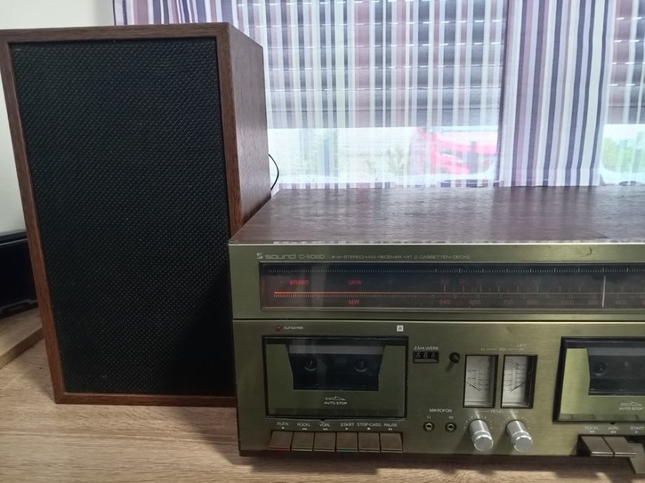Prodajem vintage receiver casseiver Sound C-6080 , sa zvučnicima i kasetofonom . Lijepog izgleda , sa dva kasetna decka i tunerom . Sa zvučnicima original Sound 5090 , zvučnici drveni širokopojasni super očuvani . Pojačalo i tuner rade , nekih 20-tak w po kanalu , svijetlo skale , stereo , skala malo hoće zapinjat , vu metri . Kasetofonima stavljene nove gumice . 4 din ulaza za zvučnike i jedan 5polni za gramofon . Cijeli receiver u drvenoj kutiji , lijepo očuvanoj , sa lijepom oblogom , dok je prednjica aluminij nježno maslinaste boje . Dimenzije 52 x 32 x 20 cm . tel 099 4722848