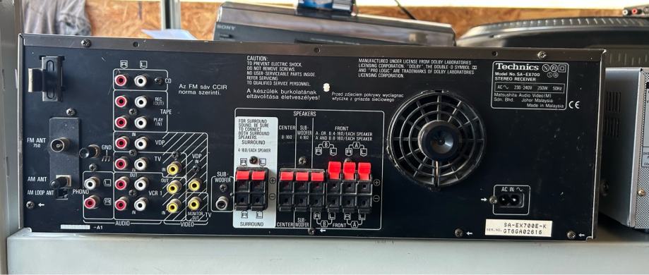 Prodajem Technics SA-EX 700 receiver, kvalitetan audio uređaj iz Technics linije. Receiver dolazi s originalnim daljinskim upravljačem. Na stražnjoj strani nalaze se brojni priključci za spajanje različitih audio izvora, uključujući višestruke RCA ulaze, izlaze za zvučnike i ostale standardne konektore. Prednja ploča ima digitalni ekran, više upravljačkih tipki i veliku regulaciju glasnoće. Uređaj omogućuje prijem FM/AM radija te pojačanje signala iz različitih izvora. 65 W po kanalu na 8 ohma. Za naglasiti je posebni izlaz za pasivni subwoofer.