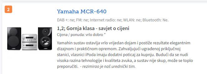 Solidan zvuk, solidne ugrađene komponente, pojačalo od nekih 75w kod 4 Ohma, izlaz za subwofer, USB, I-Pod dock...