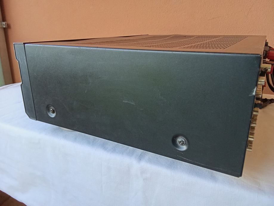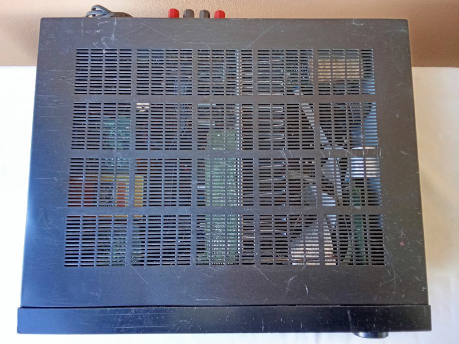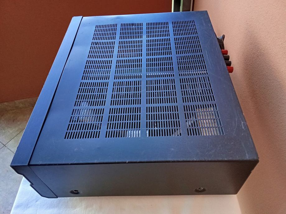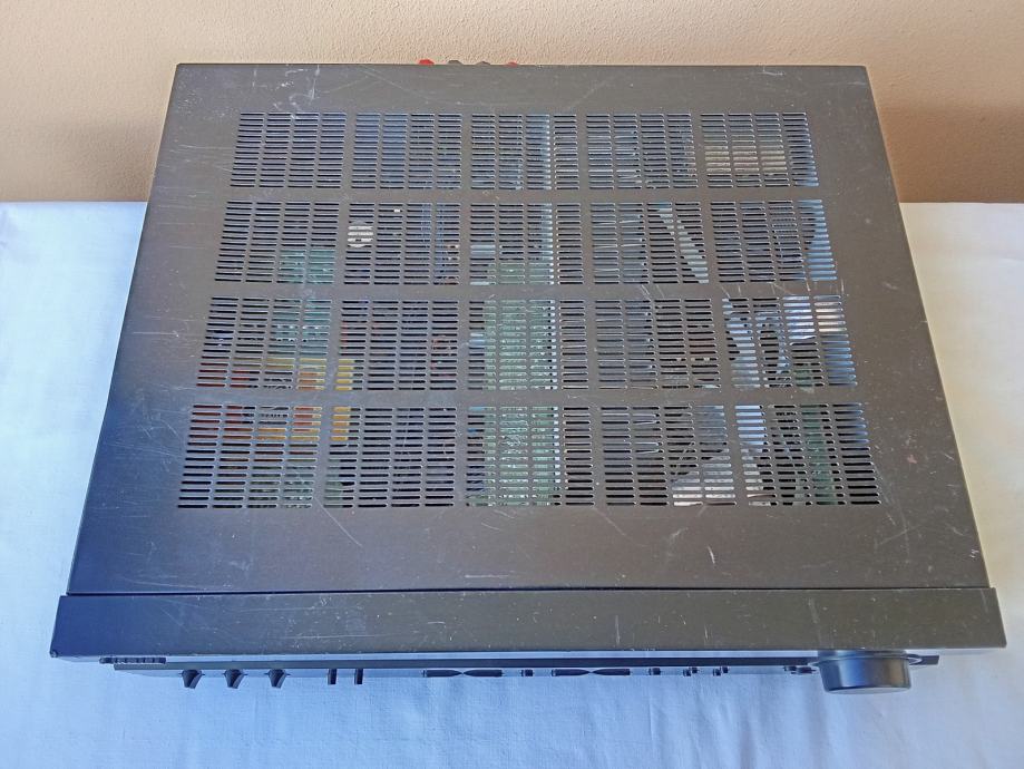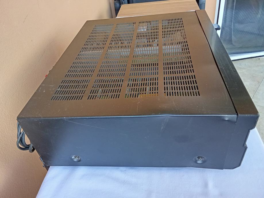 Uređaj je potpuno ispravan, pravilno reagira na pritisak bilo koje tipke, pravilno reagira na korištenje bilo kojeg potenciometra ili sklopke. Daljinski upravljač je nov, univerzalan, podešen za upravljanje ovim uređajem, njime se postiže mnogo toga što se može postići originalnim upravljačem; njime se ne može upravljati radio prijemnikom. Kupac besplatno dobiva prijemnik bluetooth signala koji se napaja iz utičnice napona 110-240 V (npr. jedna od onih na poleđini ovog uređaja), a primljeni signal kabelom šalje u bilo koji aux ulaz, također na poleđini uređaja. Fotografije priložene uz oglas prikazuju ovdje oglašeni uređaj, a zadnja prikazuje spomenuti prijemnik bluetooth signala. Na donjoj strani uređaja, stražnji podlošci su zamijenjeni. Na uređaju su samo površinska oštećenja, sve je čitavo i bez pukotina, a oklop kućišta je mjestimično izobličen.