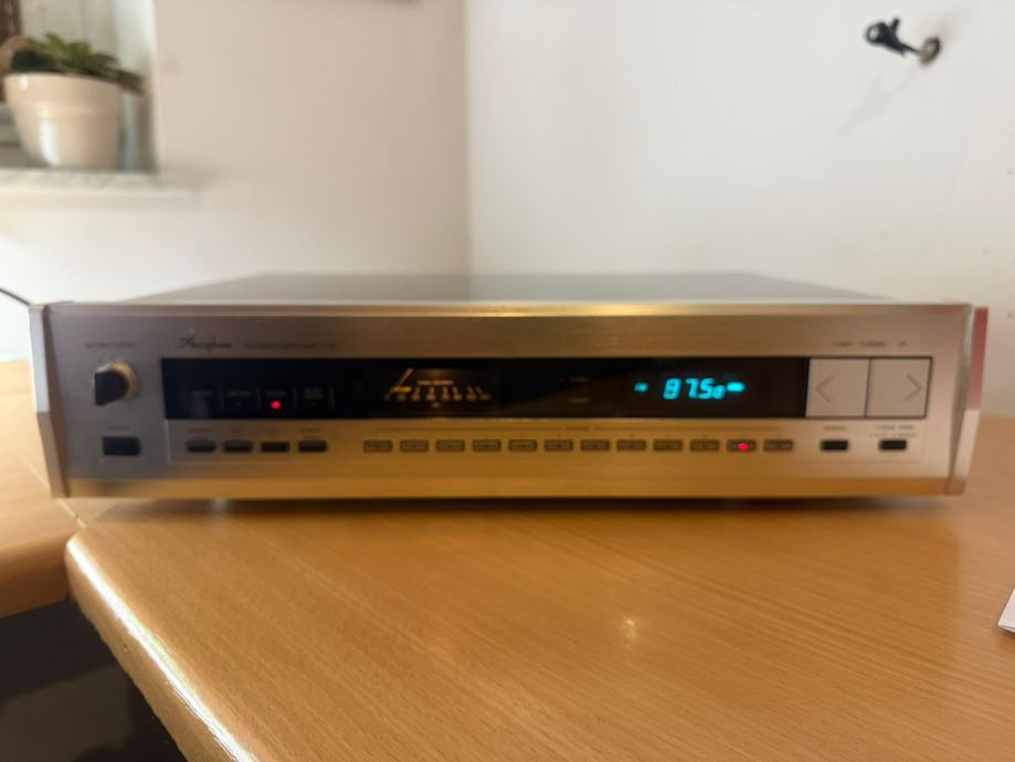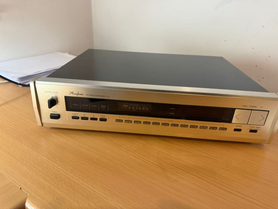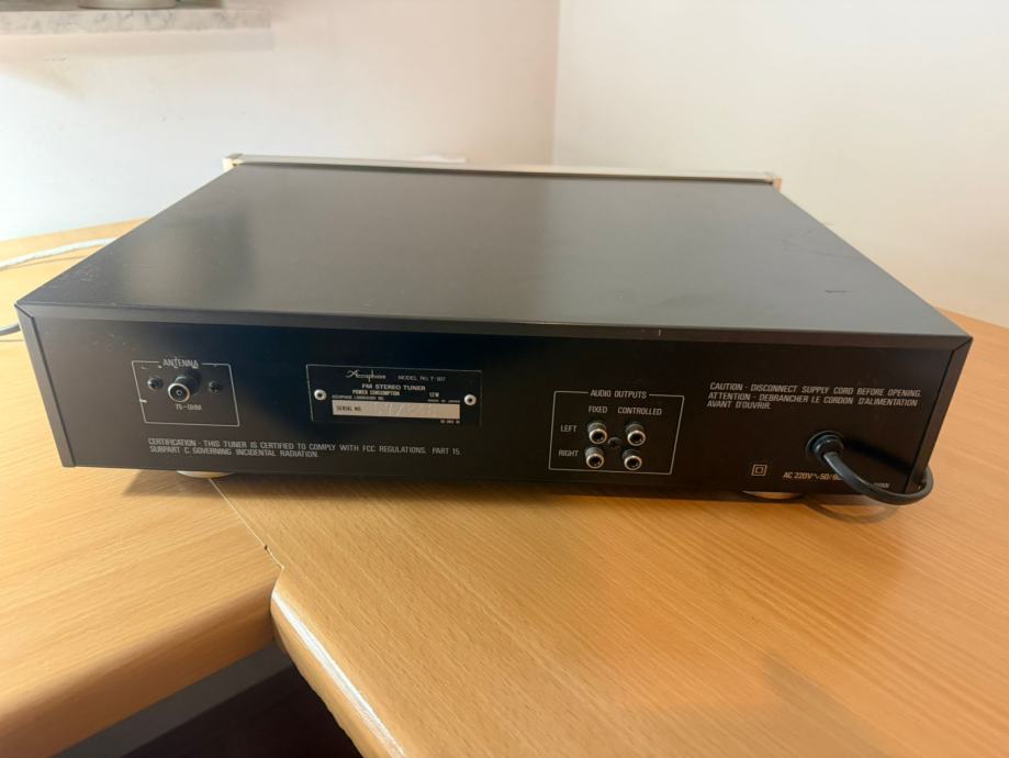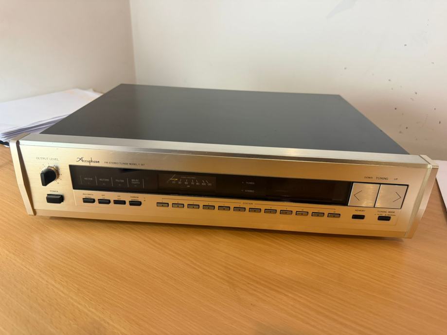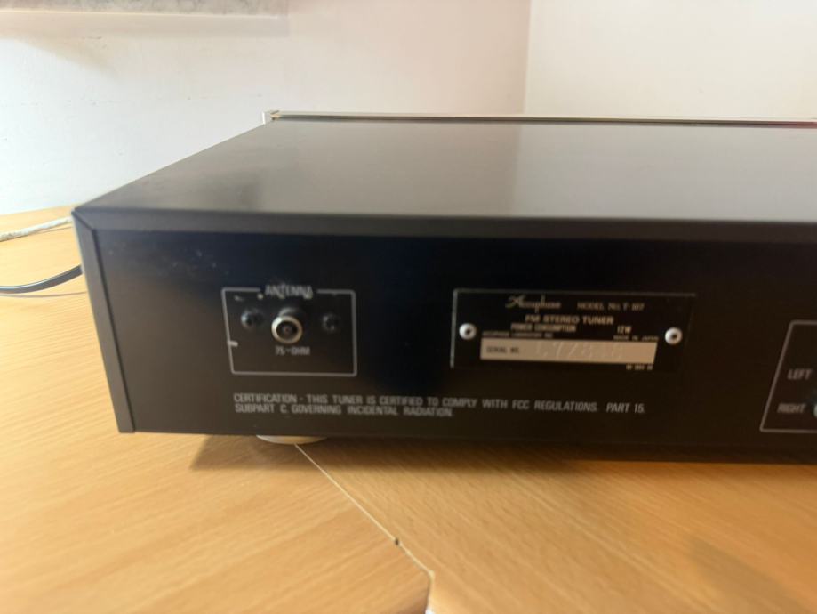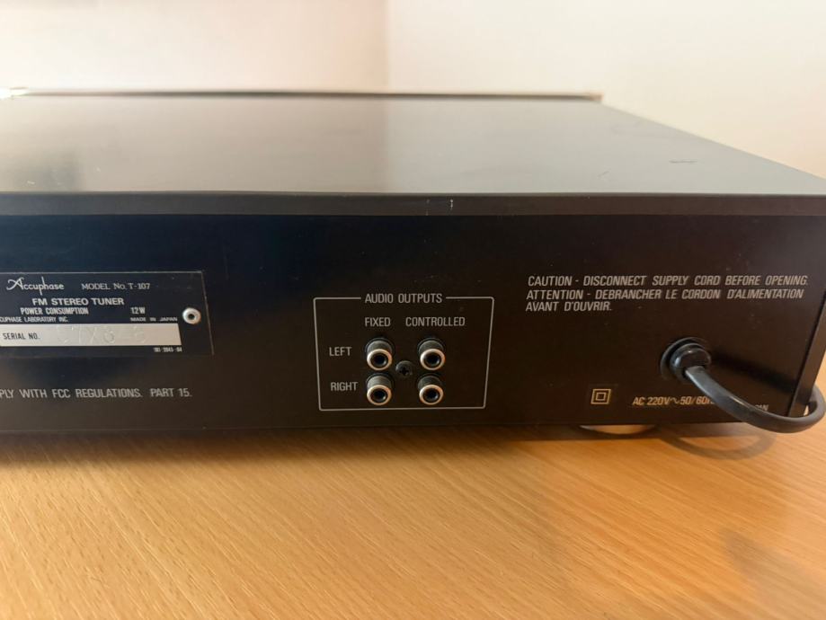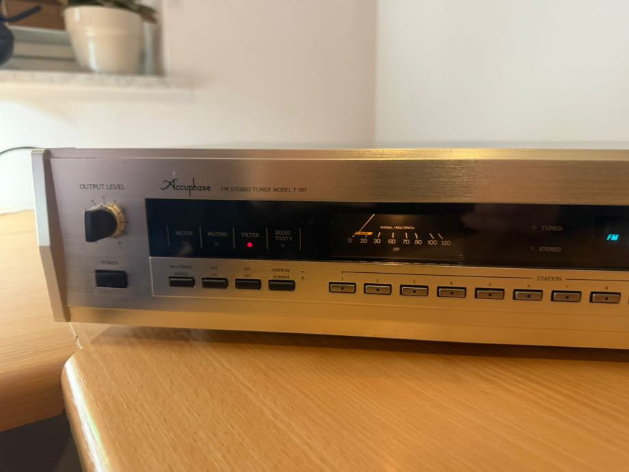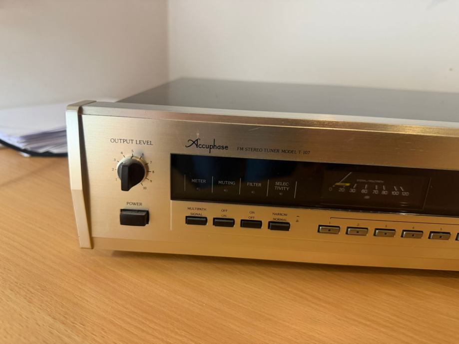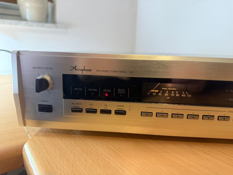 Accuphase T-107, komponenta tunera jednostavna za rukovanje i prepoznatljivog dizajna. Može se pohvaliti stabilnim performansama, visokom pouzdanošću i čistom kvalitetom zvuka podržanom suverenom Accuphase tehnologijom. Napredni tuner za ono doba uključuje PCL elektronički sklop za ugađanje, linearni detektor diferencijalnog pojačanja (DGL) koji koristi vrijeme kašnjenja brzih C-MOS IC-ova za prijam s malim izobličenjem, stereo demodulator kontroliran rezonatorom naprednog dizajna i visokokvalitetno audio-frekvencijsko pojačalo za poboljšanu kvalitetu zvuka.