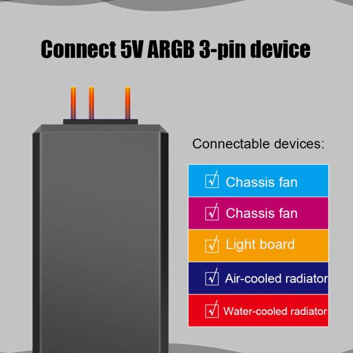 3-pin ARGB pin connector, SATA power supply, one connected to 5V ARGB 3-pin device, one connected to SATA power supply.