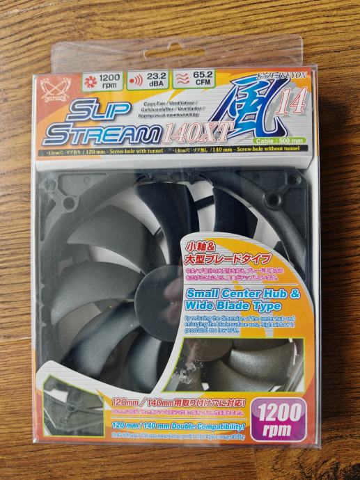 Scythe Slip Stream 140XT. Type: Fan, Fan diameter: 14 cm, Rotational speed (max): 800 RPM, Noise level (high speed): 14.3 dB, Maximum airflow: 43.5 cfm, Airflow: 73.9 m³/h, Maximum air pressure: 0.448 mmH2O. Voltage: 12 V. Width: 140 mm, Depth: 140 mm, Height: 25 mm.