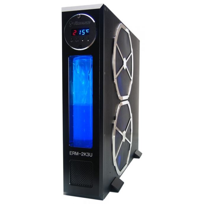 The ERM-2K3U continues Koolance's "ERM" series of dedicated liquid cooling systems for special thermal applications. It can provide up to approximately 2000W of potential heat dissipation. A prominent white LED-lit reservoir displays the coolant level, combining a waterfall effect when placed upright.