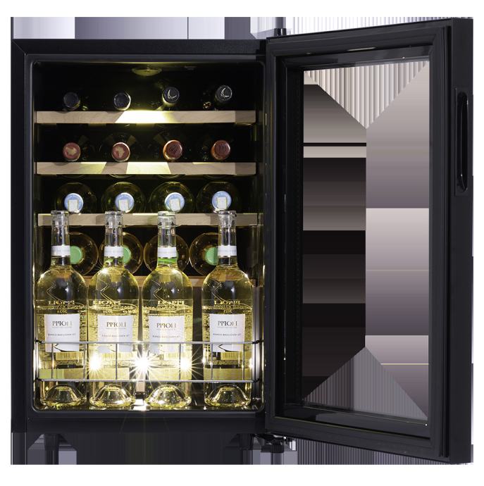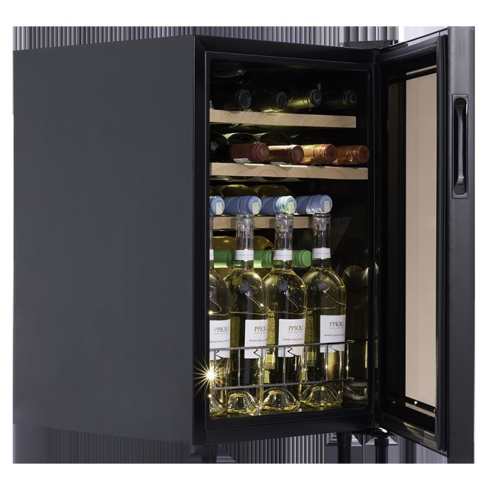 Kompresorski hladnjak za vino namijenjen kao samostojeći model. Njegov elegantan crni izgled, unutarnja svjetlost čine ga posebno uočljivim u restoranima ili u vašem domu. Boce se smještene na drvenim policama. Unutarnja temperatura prikazana je LCD indikatorima. Ovaj model nije namijenjen za ugradnju.