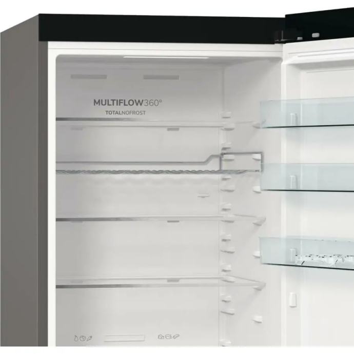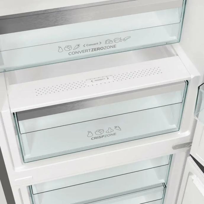 Gorenje hladnjak iz Apeksa odlikuju: Elegantan dizajn u crnoj boji koji se savršeno uklapa u suvremene kuhinje. S ukupnim kapacitetom od 413 litara (253 l hladnjak, 130 l zamrzivač), idealan je za veće obitelji. Staklene police koje su istovremeno čvrste i elegantne, s dodatkom praktične ladice za voće i povrće (CrispZone) koja čuva svježinu namirnica. Ventilacijski sustav MultiFlow 360° ravnomjerno raspoređuje zrak, održavajući optimalnu temperaturu i svježinu namirnica. NoFrost Plus tehnologija sprječava nakupljanje leda, eliminirajući potrebu za ručnim odleđivanjem. Funkcija FastFreeze zamrzava hranu na -24 °C kako bi se sačuvali minerali i kvaliteta namirnica. Energetski razred C i razina buke od 29 dB osiguravaju učinkovitu i tihu upotrebu.