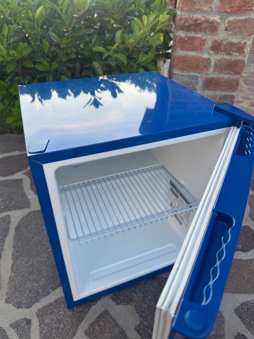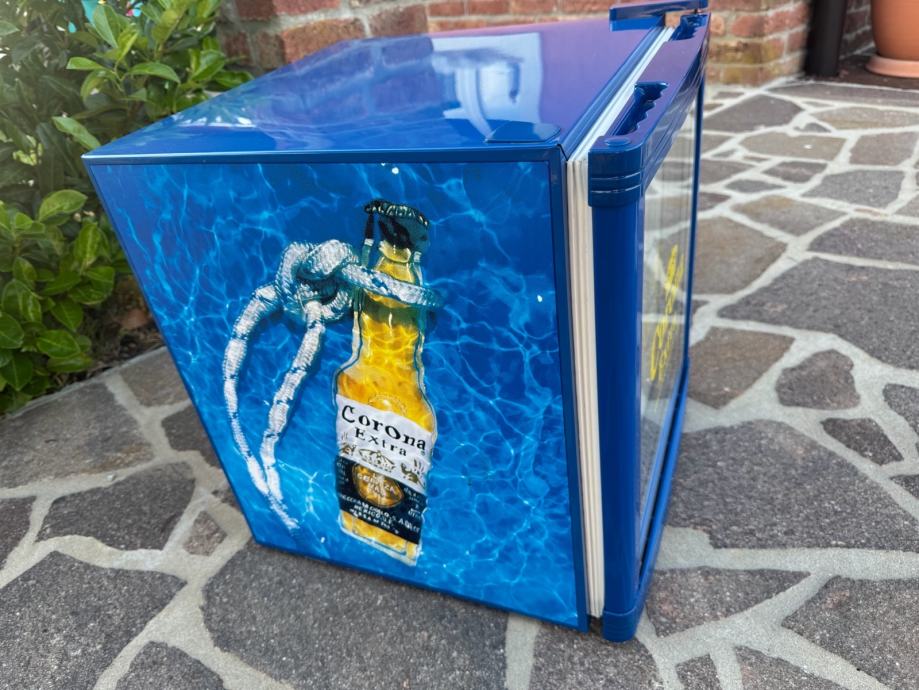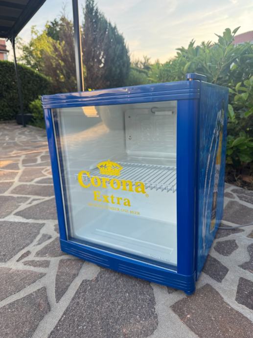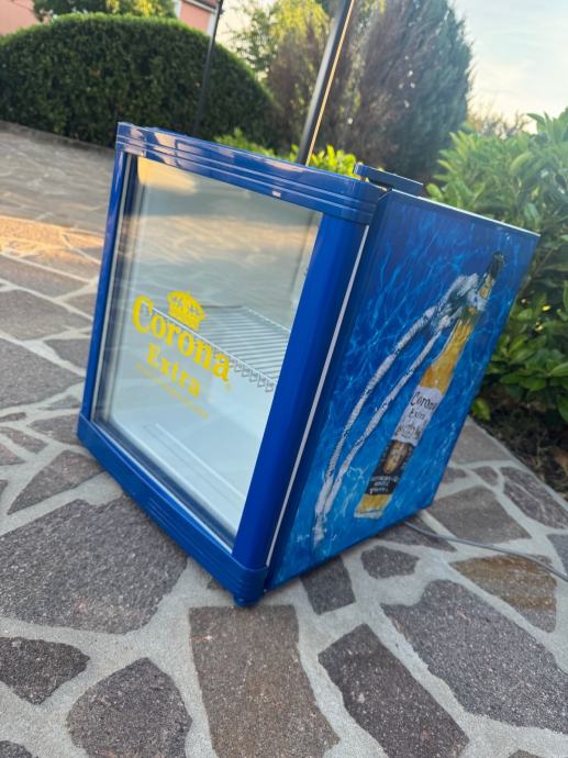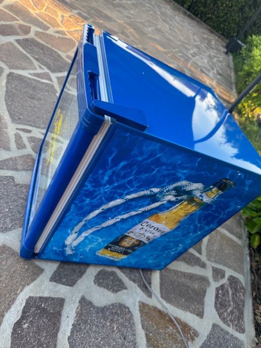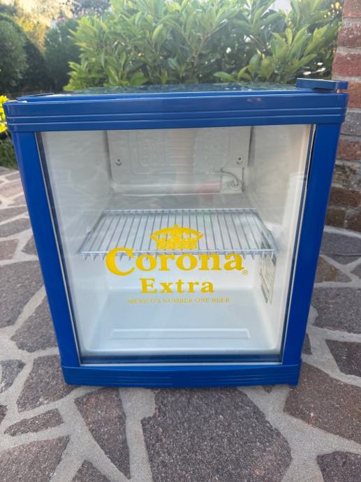 Prodajem mini hladnjak Corona Extra u prepoznatljivoj plavoj boji s logotipom brenda na staklenoj fronti. Radi se o kompaktnom uređaju s prozirnim staklenim vratima i unutarnjom rešetkom za postavljanje pića. Stranice su ukrašene Corona Extra grafikom. Hladnjak je rabljen.