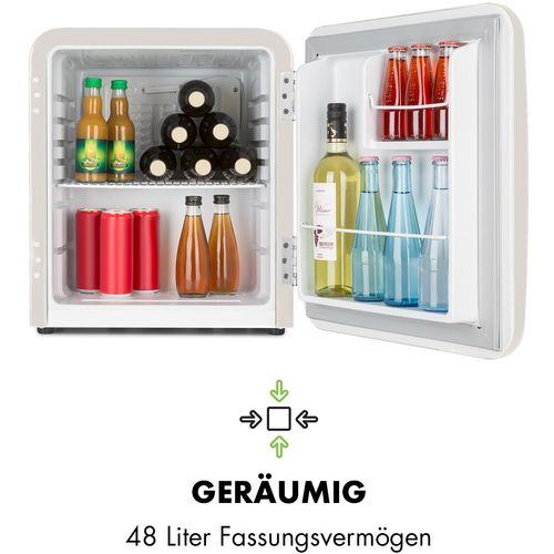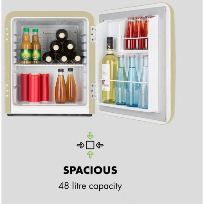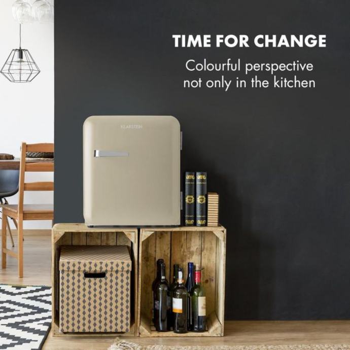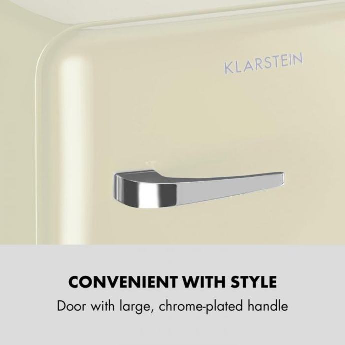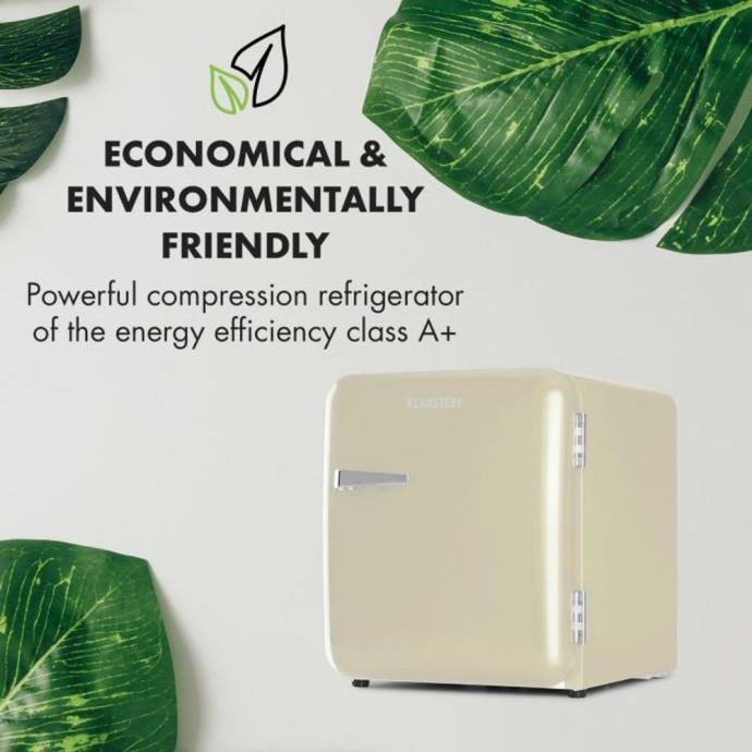 Elegantni uređaj će vas osvojiti svojom elegantnom retro svježinom. S 48 litara prostora za pohranu, nudi dovoljno mjesta za svježu hranu i napitke . Za red u hladnjaku će se pobrinuti dvije police, kao i dva pretinca u vratima za boce, čaše i limenke. Sve je upotpunjeno Vint-Age konceptom: zaobljeni oblici i kromirana kvaka na vratima vraćaju stil 50-ih u vašu kuhinju. Temperatura se može podesiti između 0 i 10 °C, za ispravan stupanj svježine. Prostorno- štedljivi hladnjak se, zahvaljujući svojoj modernoj, tihoj tehnologiji kompresijskog hlađenja, odlikujem niskom potrošnjom, što ga svrstava u klasu energetske učinkovitosti F, što je u interesu okoliša i vašeg novčanika.