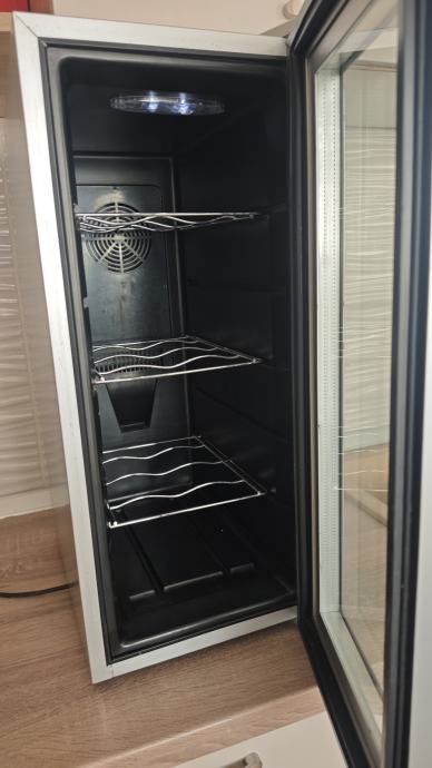 Prodajem mini hladnjak za vino u sivoj boji sa staklenim vratima. Hladnjak ima kapacitet za skladištenje 12 boca zahvaljujući metalnim policama unutar komore. Opremljen je digitalnim displejom za podešavanje temperature i LED osvjetljenjem u unutrašnjosti. Kompaktan je i pogodan za postavljanje na radnu površinu ili bilo gdje u prostoru gdje želite imati vino pri optimalnoj temperaturi. Unutrašnjost je crne boje s kromiranim policama. Funkcionalan i praktičan uređaj za ljubitelje vina.