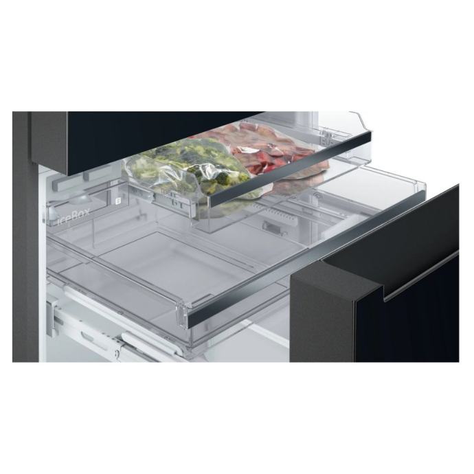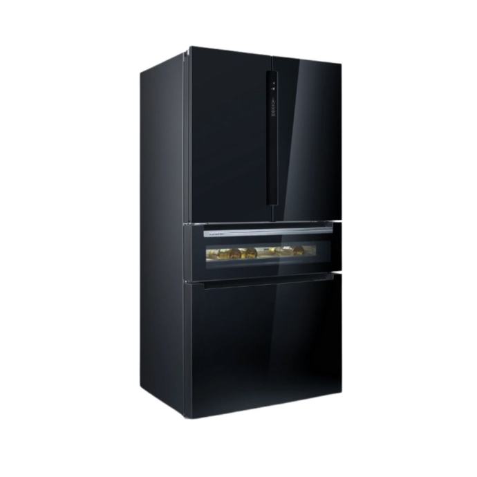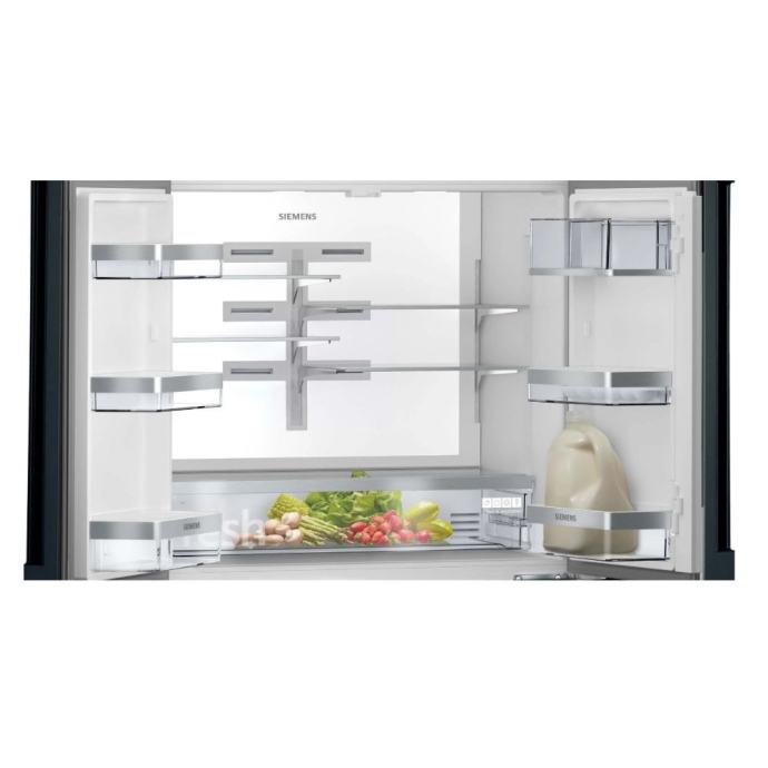 Siemens KF96RSBEA Side-by-Side hladnjak nudi velikih 572 l kapaciteta uz Total NoFrost tehnologiju i ravnomjerno hlađenje zahvaljujući Multi-Airflow sustavu. Staklena vrata, LED osvjetljenje i posebna ladica sa senzorom blizine za najfinija vina, pjenusce ili Vase najdraze pivo pa i sokove pružaju moderan izgled i maksimalnu preglednost. Tih rad od 39 dB, super hlađenje i super zamrzavanje čuvaju svježinu hrane uz jednostavno korištenje bez odleđivanja.