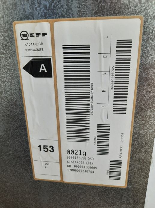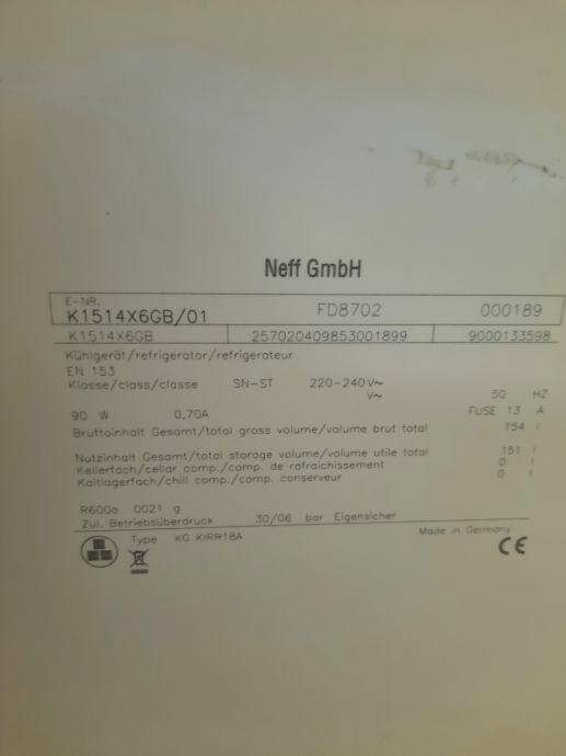 Ugradbeni hladnjak NEFF GmbH K1514X6GB, model FD8702, je proizveden u Njemackoj za Englesko trziste, (oznaka GB) i uvezen prije nekoliko godina.
