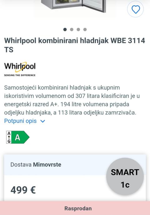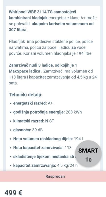 Prodajem kombinirani hladnjak "Whirpool" 300 litara potpuno ispravan i maksimalno sačuvan. Star 6 godina,radi odlično. Kupljen novi veći hladnjak te je ovaj višak. Cijena 150 eura.