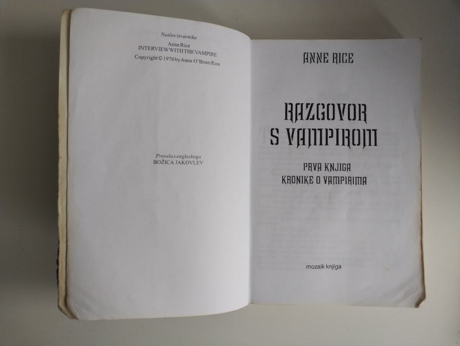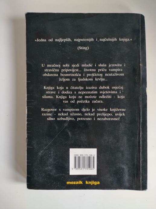 Prva knjiga Vampirskih kronika Anne Rice. Naslovnica malo pohabana, knjiga generalno u dobrom stanju, vide se znakovi korištenja.