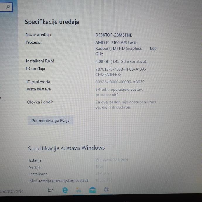 Računalo je ispravno is spremno za rad, te je instaliran Windows 10.
