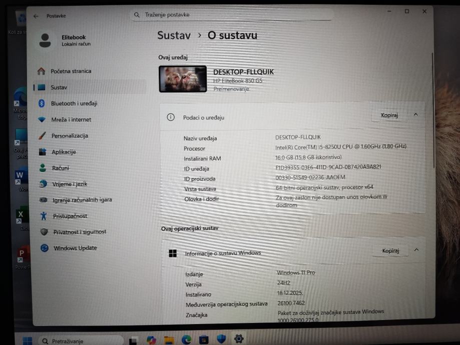 Prodajem rabljeni HP EliteBook 850 G5 s Intel i5 osme generacije procesora, 16GB RAM-a ( Adata ddr4 3200 Mhz ) i 512GB ( NV3 PCIe 4.0 NVMe M.2 ) diskom. Laptop ima 15.6-inčni Full HD ekran, dolazi s instaliranim Windows 11 Pro operativnim sustavom i licenciranim Office 2021 Pro plus paketom programa ( Word, Excel itd.). Laptop kvalitetne izrade ( za razliku od većine današnjih ) u aluminijskom kučištu u odličnom stanju. Bang&Olufsen zvučnici za kristalno kvalitetan zvuk. Brz je u radu te idealan za posao, školu...Baterija traje 3-4 sata.