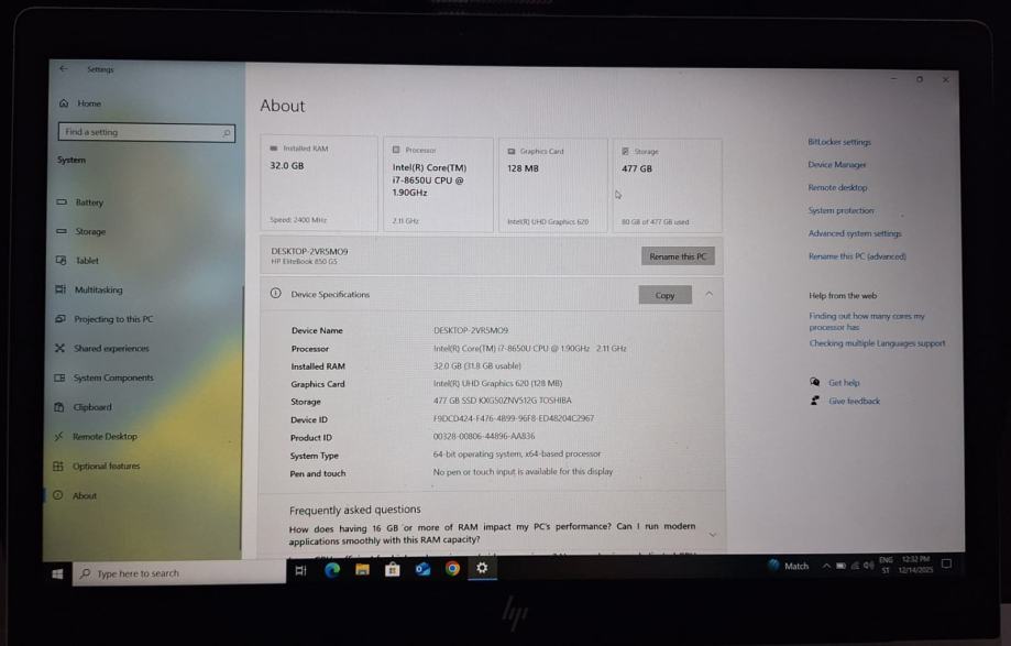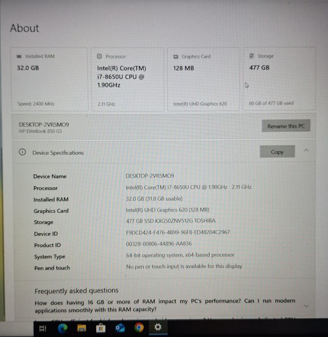 HP Elitebook 850 G5, 15.6”, i7-8650U 480GB SSD 32GB, Win10 Education