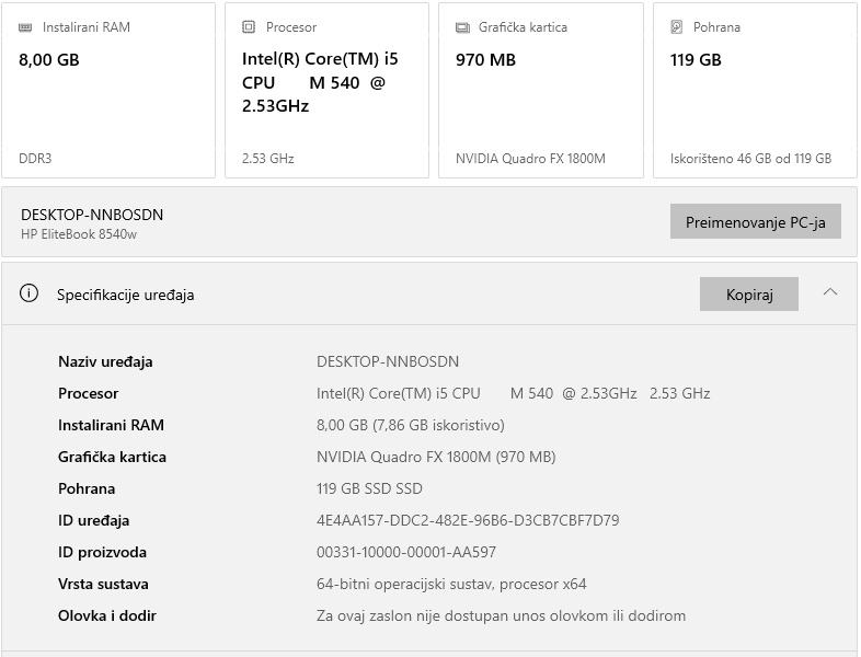 procesor i5, 8gb RAM-a, 120 GB brzi SSD, Nvidia quadro grafička kartica.