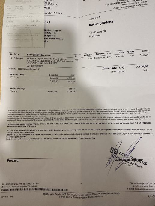 Nedavno kupljen i novi AC adapter 65W isto pod garancijom (racun posjedujem).