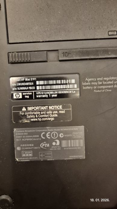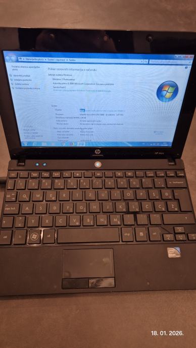 HP MINI 5101, ekran 10". Baterija ne drži, pa mora raditi na punjaču. Jedan utor usb-a nije u funkciji. Uz laptop dolazi i torba.