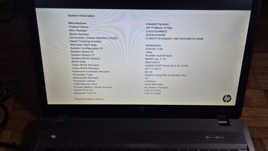 Na prodaju je HP ProBook 4740s. U njemu se nalazi procesor i5-3210M. Laptop prima struju i pali, testiran do ulaska u BIOS. Kozmetičko stanje laptopa je vrlo dobro, na njemu se nalazi HR tipkovnica. Flet kabel prekida kontakt sa ekranom, ekran ispravan. Na prodaju je bez memorije, diska, punjača i baterije. Laptop se prodaje samo u komadu.