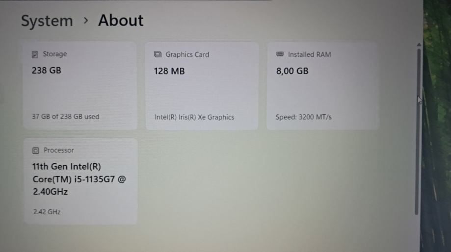 PROCESOR: 11th Gen Intel Core i5-1135G7 @ 2.40GHz (2.42 GHz)