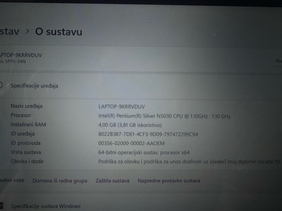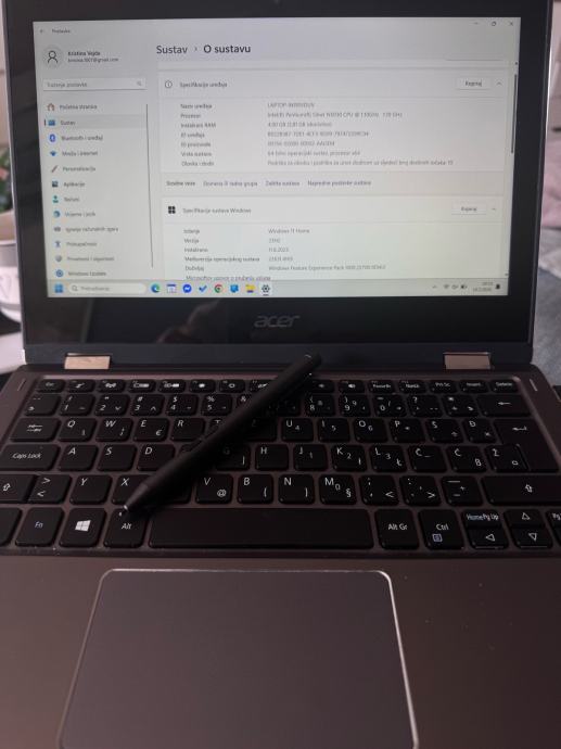 Prodajem mali Acer laptop/tablet 2 u 1, koji radi na Windows 11 Home operativnom sustavu. Procesor je Intel Pentium Silver N5030, RAM memorija iznosi 4 GB, a pohrana je 64 GB eMMC uz mogućnost proširenja. Ekran je osjetljiv na dodir, što ga čini praktičnim za korištenje i kao tablet i kao klasični laptop. Uz uređaj dolazi i stylus olovka. Tipkovnica je kompaktna i funkcionalna, a cijeli uređaj je manjih dimenzija, što ga čini lakim za prenošenje. Poklon torba