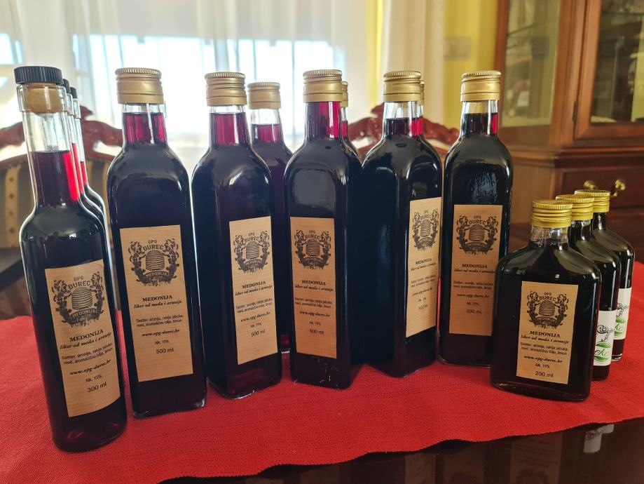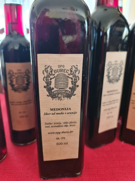 Napitak od meda i aronije sa blagim udjelom alkohola radi kozervacije poput likera. Odlično za anemiju i opće zdravlje. Više o našim proizvodima i uslugama na www.opg-durec.hr Cijena za 0.5 litara 7€ Cijena za 0.3 litara 4 €
