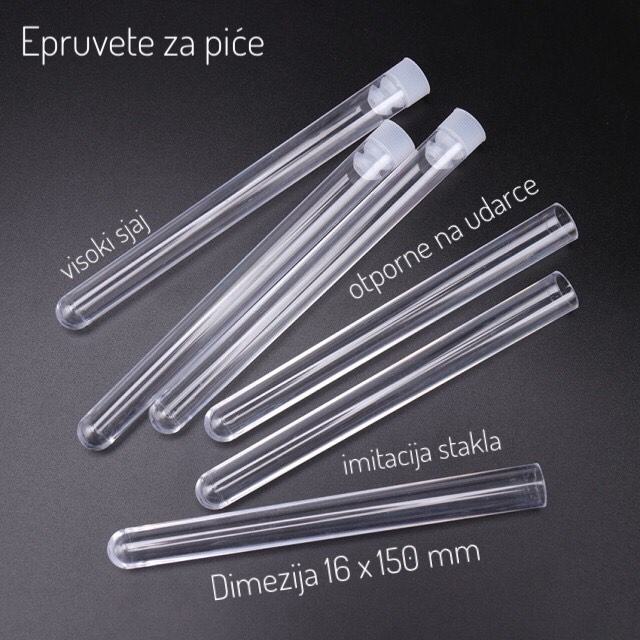 Epruvete su dužine 15 cm, zapremine 20 ml. (standardna veličina kao Jagermaister epruvete) prozirne su i plastične (imitacija stakla).