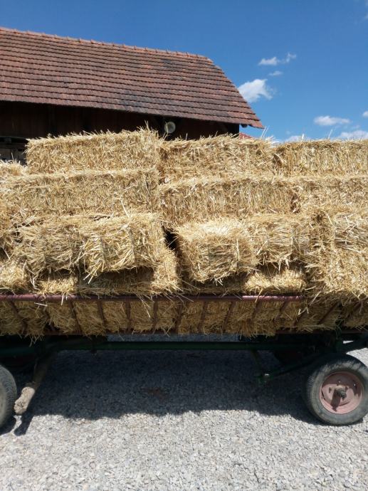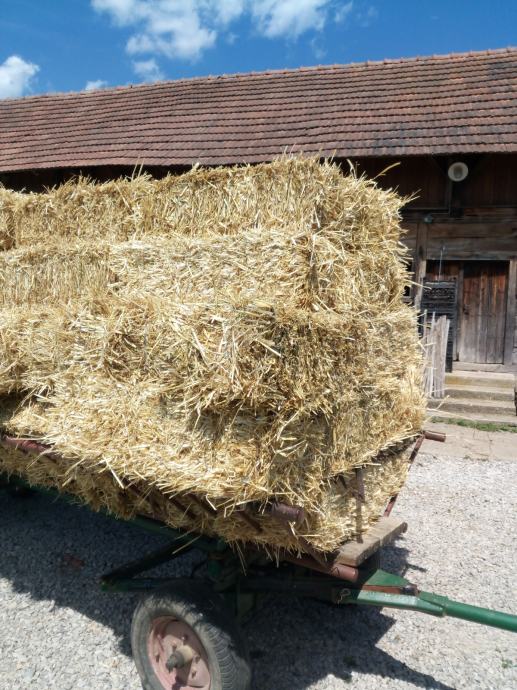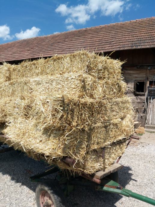 Prodaje se vrlo kvalitetna slama u kockastim balama(pšenica,ječam) žetva 2025god.Po slami nije padala kiša što se vidi i na slici jer je zlatno žute boje i nema trave u njoj,cca 300 bala 1.8 eura/kom.