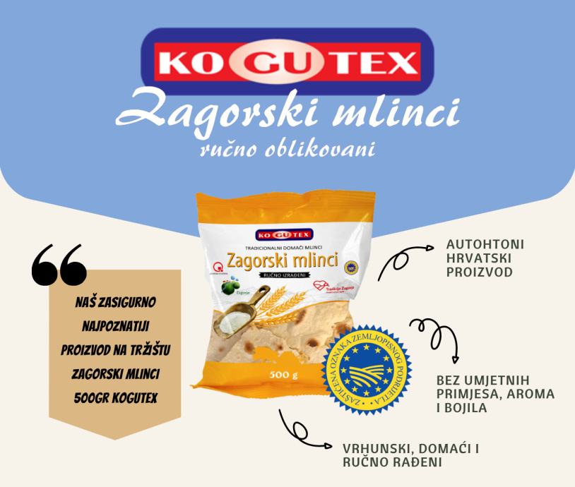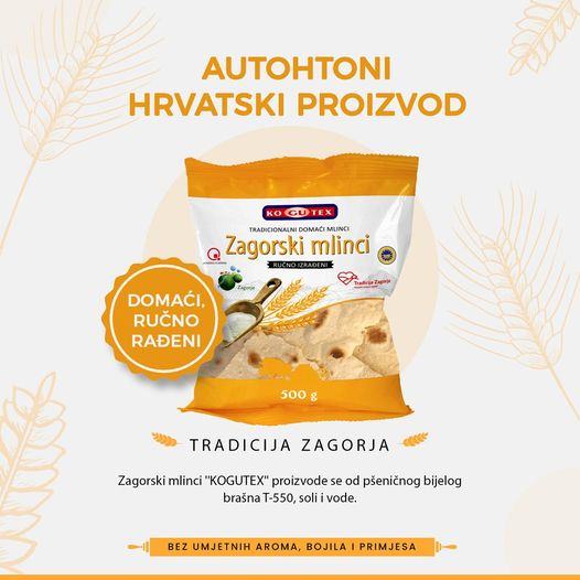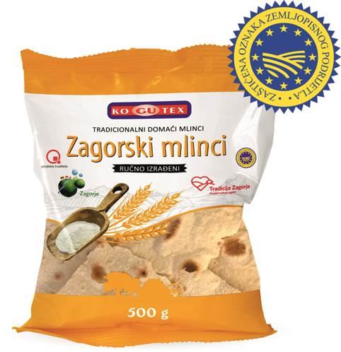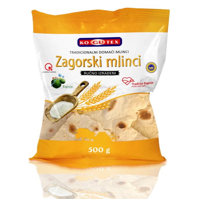 Prepoznatljive su ambalaže, izgleda i lomljive teksture. Sastav : pšenično bijelo glatko brašno t550, sol i voda. Izrađeni isključivo ručnim postupkom, tijesto se ručno razvlači i peče na zagrijanim metalnim pločama, te se nakon toga odlaže na police gdje se suši do gotovosti, i Zagorski mlinci su spremni za pripremu i konzumaciju. Proizvode se bez dodataka primjesa, umjetnih bojila i aroma, bez kvasni su proizvod koji sadrži gluten. Proizvod je zaštićen oznakom zemljopisnog podrijetla na nivou EU te nositelj oznake Hrvatska kvaliteta. Certificirani smo proizvođač od strane Bureau Veritas Hrvatska.