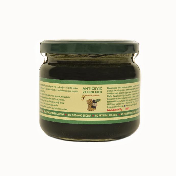 Zeleni med extra, slovi kao “PRIRODNI LIJEK” zbog iznimno ljekovitog sastava, ima širok spektar djelovanja, odnosno izlječenja kod skoro svih oblika KARCINOMA. Prvenstveno je namijenjen za jačanje otpornosti organizma, pomaže kod kašlja, bronhitisa, astme, anemije, iscrpljenosti organizma, gastritisa, regulira probavu, smiruje organizam, djeluje antialergijski i antibakterijski.