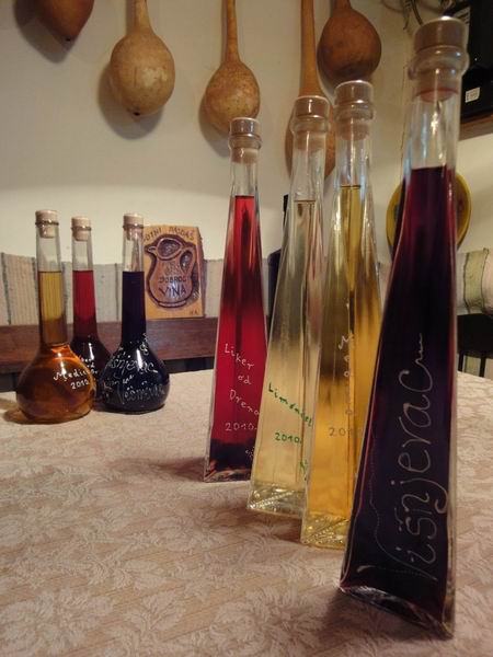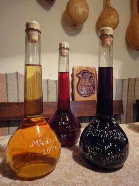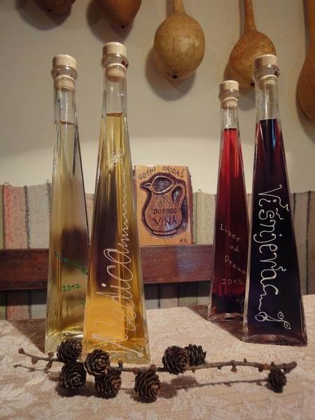 Rakije: lozu (tropicu) od traminca odstajalu 10 godina u hrastovoj bacvi, loza sa smokvom unutra, loza sa kruskom tepkom.