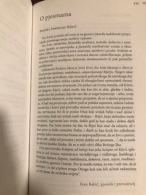 Fra Antin poetski stil često je na granici između nadahnute propovijedi, poetskoga eseja, molitve i pjesme. Fra Ante istodobno filozofski analizira, teološki deducira i sintetizira, ljudski se ispovijeda, a pjesnički meditativno uranja u iskaz, tekst, sliku, proizvodeći nova značenja, smislove i pouke. U ovoj knjizi svakom se slikom i riječju oduševljava i uzvraća darom oduševljavanja, pritom ne prikrivajući umišljenu duhovnu dominantnost ili pak pjesničku umišljenost. Fra Ante kroz ove pjesme polazi od čvrsta temelja, od Krista, od njegove Riječi, zalazi među iste kao što je sam, gladne i žedne, među one što padaju; daje im ono što je najprimjerenije - sebe, svoju ispovjednu iskrenost, svoje mane, propuste, da se u njemu prepoznaju.